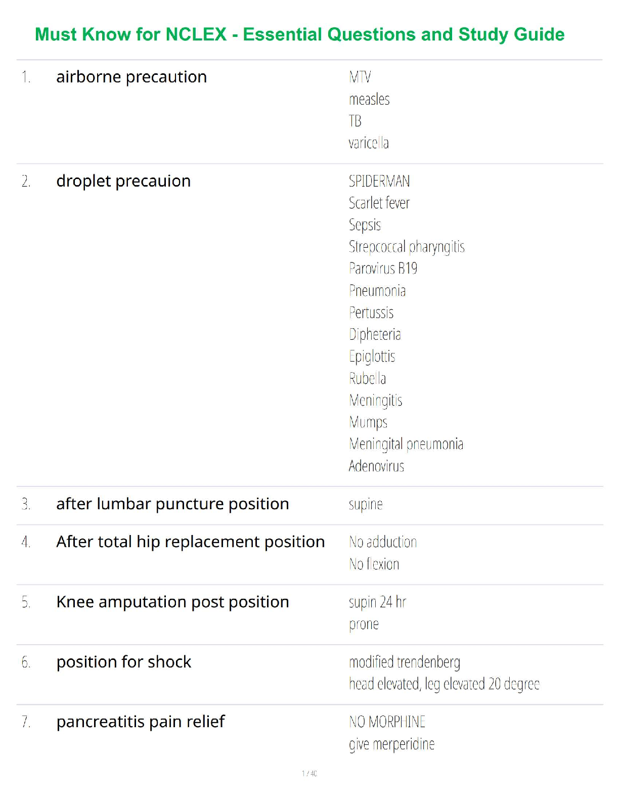 Unlock your success in the NCLEX with this comprehensive and updated study guide for the 2025/2026 academic year. This resource compiles crucial 'must-know' essential questions and their concise answers, designed to help you confidently navigate your exams. Master vital nursing concepts such as airborne and droplet precautions, critical patient positioning for post-operative care (lumbar puncture, total hip replacement, knee amputation), management for shock, and effective pain relief strategies for pancreatitis. Prepare to ace your NCLEX on the first attempt and avoid costly resits with this focused and high-yield content.