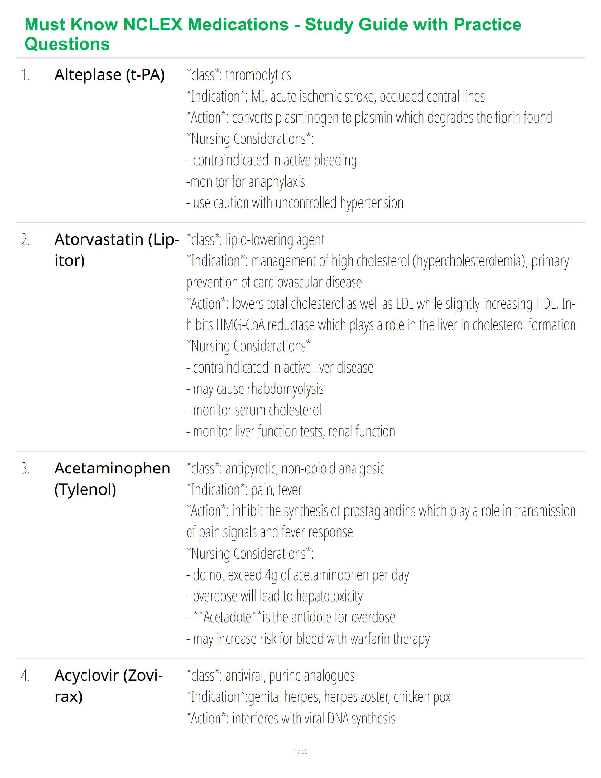 Elevate your NCLEX preparation with this comprehensive 'Must-Know' Medications Study Guide, meticulously prepared for the 2025/2026 academic year. Designed to ensure you pass your nursing licensure exam on the first attempt and avoid costly resits, this essential resource breaks down critical pharmacology concepts. Each vital medication, including key drugs like Alteplase, Atorvastatin, Acetaminophen, and Acyclovir, is thoroughly presented with its pharmacological class, primary indications, mechanism of action, and crucial nursing considerations. This guide simplifies complex drug information, making it easier to understand, retain, and effectively apply during your NCLEX examination, boosting your confidence for exam day.