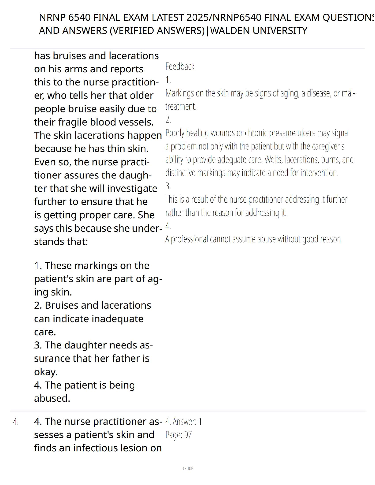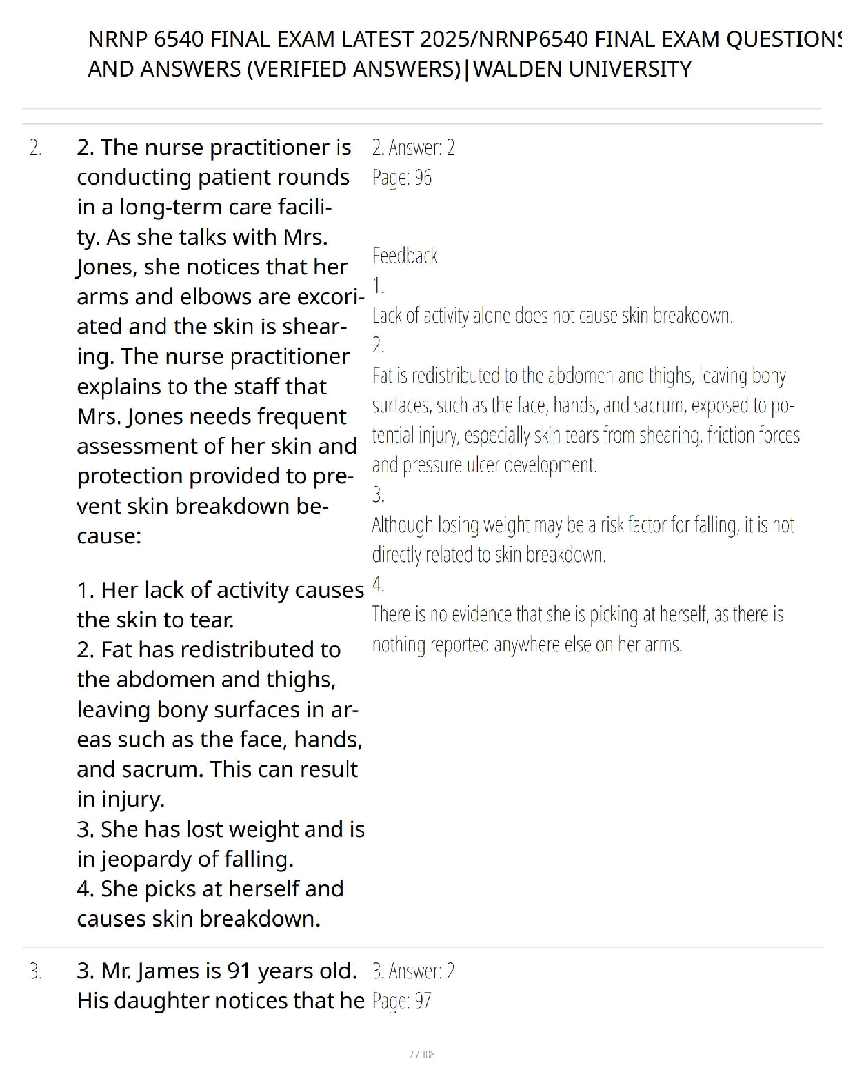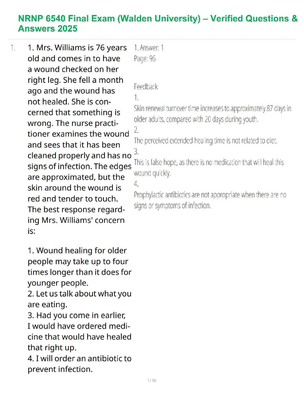 This resource provides verified questions and answers for the NRNP 6540 Final Exam from Walden University, released for the 2025 academic year. It's designed to help nursing practitioners pass their exams on the first attempt, avoiding resits. Includes a detailed breakdown of a case study involving Mrs. Williams and wound healing in older adults, with explanations for each answer choice.