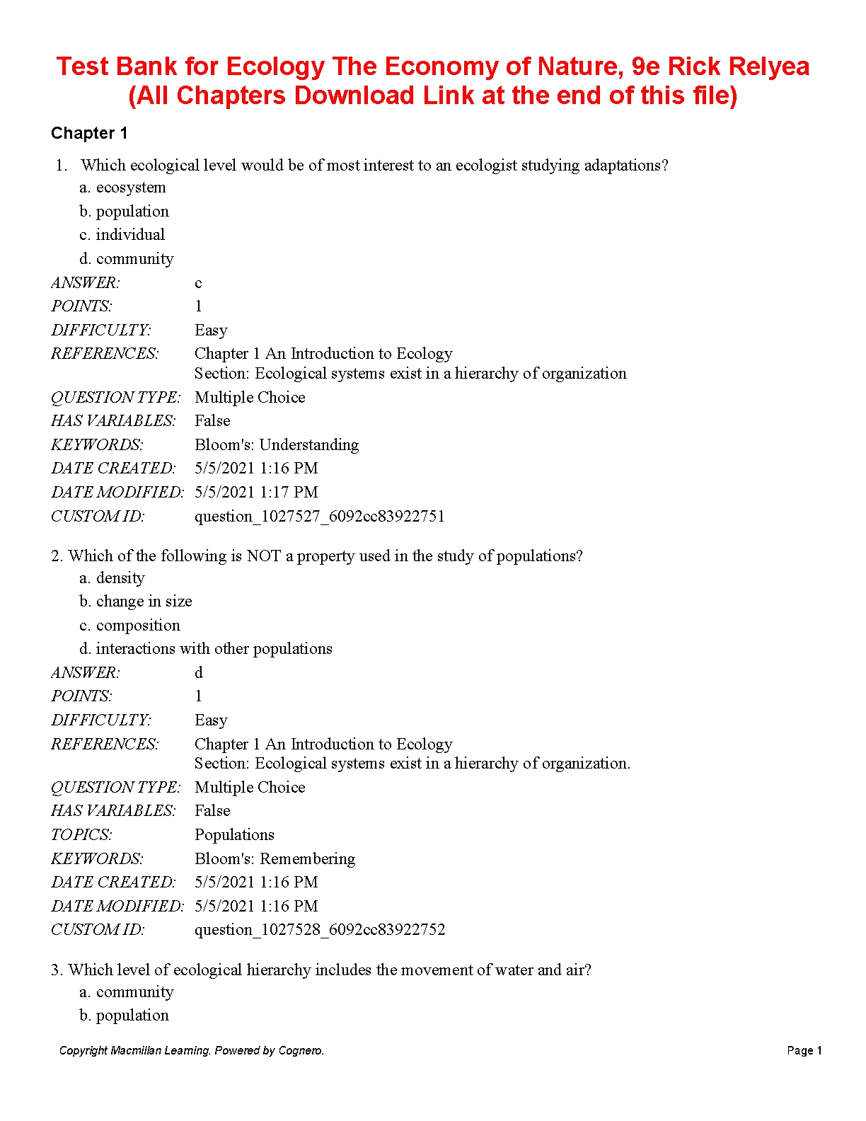 Test Bank for Ecology The Economy of Nature, 9TH EDITION BY Rick Relyea (All Chapters Download Link at the end of this file). DOWNLOAD on www.hackedexams.com INSTANTLY.