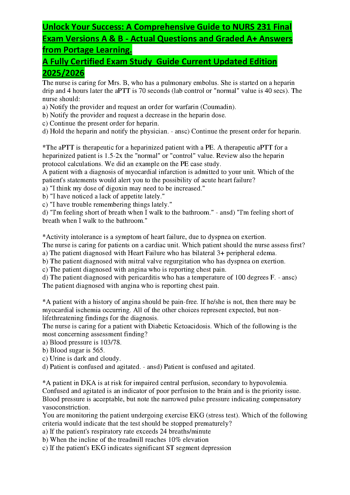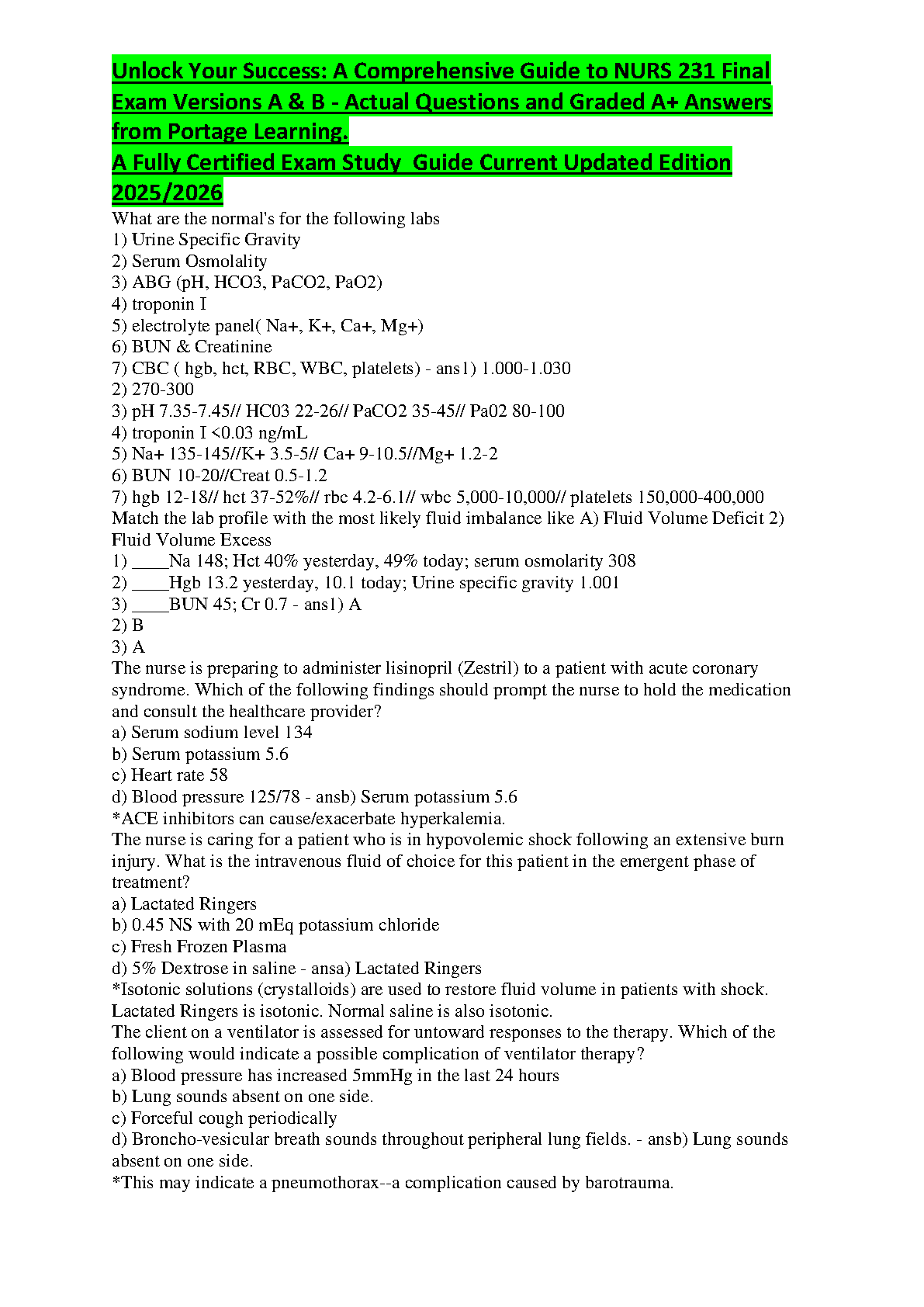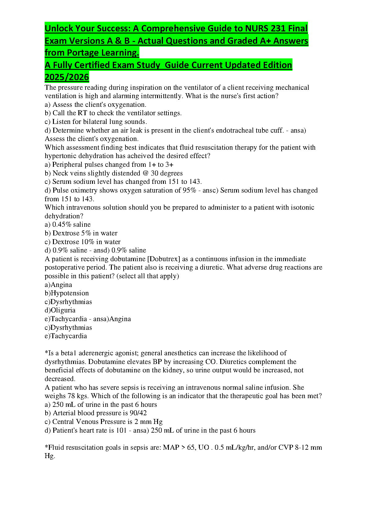 Unlock Your Success: NURS 231 Final Exam Study Guide (Portage Learning) - 2025/2026 Edition - Comprehensive Questions and Graded A+ Answers by Jane Q. Public and John Doe