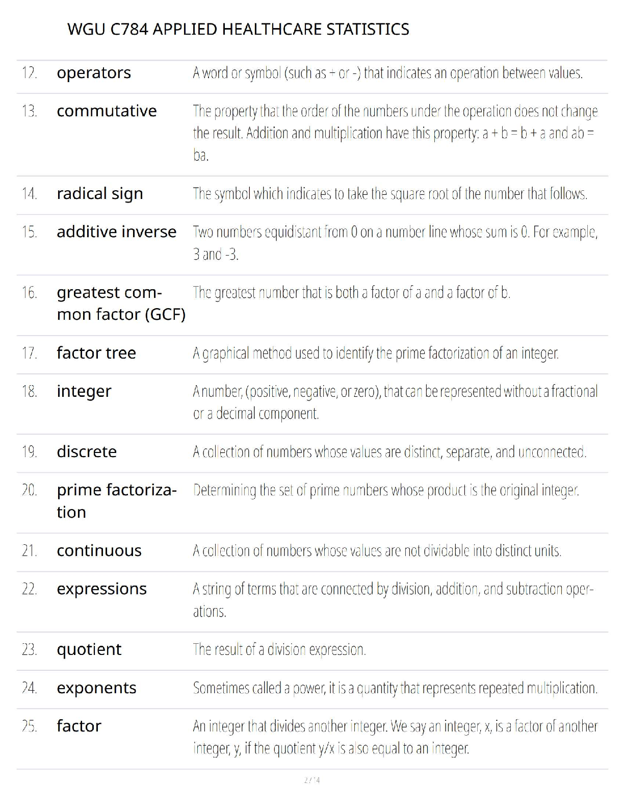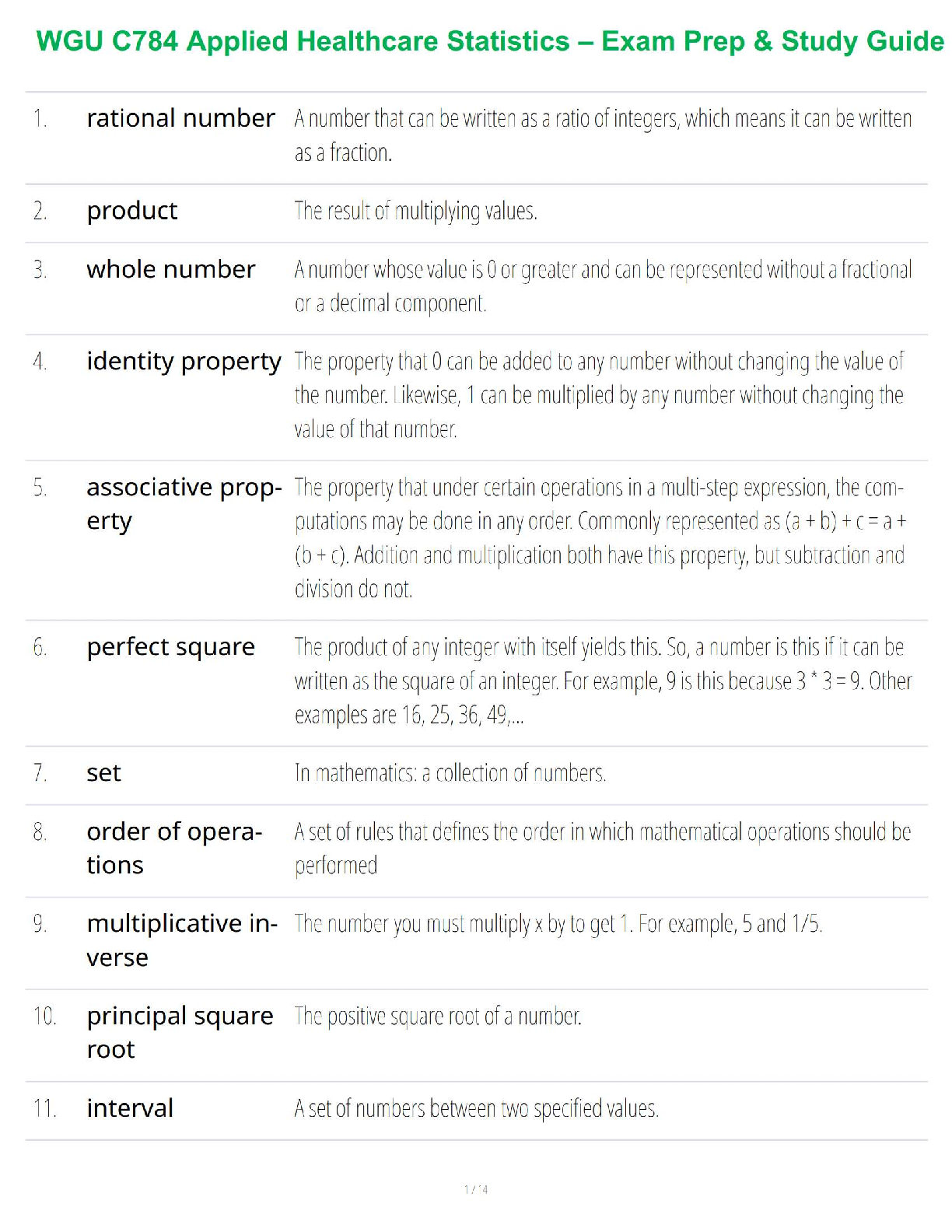 Unlock unparalleled success in your WGU C784 Applied Healthcare Statistics course with this meticulously crafted 2025/2026 study resource. This indispensable guide meticulously breaks down complex statistical and mathematical concepts, providing clear, concise definitions for terms such as rational numbers, associative properties, and order of operations. Specifically designed for the upcoming academic year, it equips students with the foundational knowledge required to confidently ace their exams on the very first try, effectively eliminating the risk of costly resits and paving the way for academic excellence. Elevate your understanding and secure your distinction.