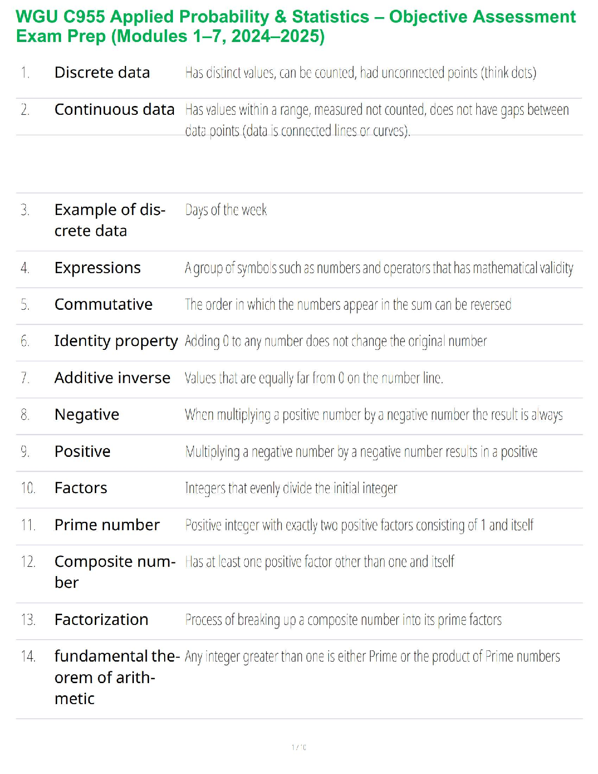 Unlock success in your WGU C955 Applied Probability & Statistics Objective Assessment with this comprehensive exam prep guide for the 2024-2025 academic year. Covering essential concepts from Modules 1-7, including discrete and continuous data, mathematical expressions, number properties, factors, and prime numbers, this resource is meticulously designed to help you master foundational topics. Prepare effectively to pass your exam on the very first attempt and confidently avoid costly resits, ensuring you achieve your academic goals efficiently.