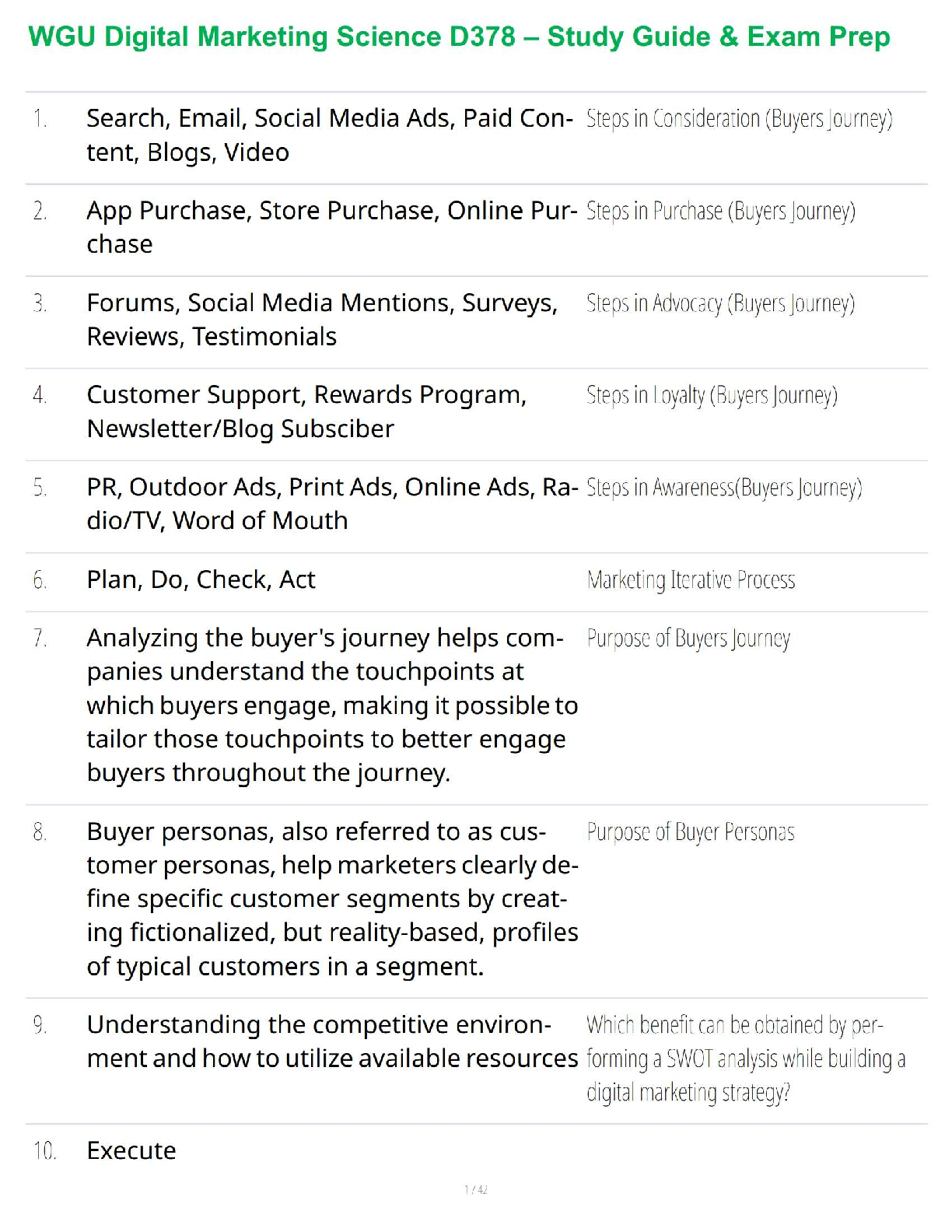 Ace your WGU Digital Marketing Science D378 course with this comprehensive study guide and exam preparation resource. Designed for the 2025/2026 academic year, this guide covers key concepts like the buyer's journey, buyer personas, marketing iterative processes, and competitive analysis. Equip yourself with the knowledge needed to excel on your first attempt and prevent resits. This resource breaks down complex topics into digestible sections, ensuring you understand critical elements for digital marketing success.