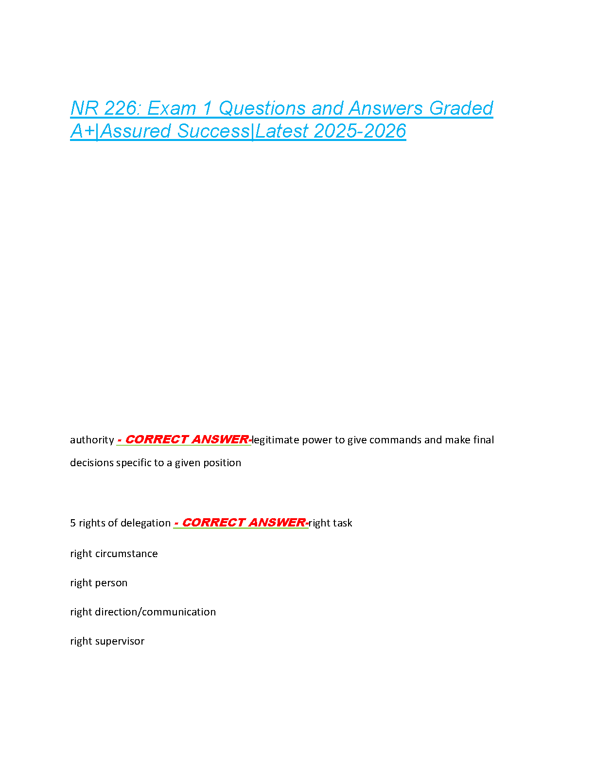 Achieve assured success in NR 226 Professional Nursing I with this comprehensive test bank and study guide for Exam 1. Specifically designed for the 2025-2026 academic year, this resource offers a wealth of expertly curated questions and verified answers, covering critical topics such as authority and the 5 rights of delegation. Utilize this premium material to confidently pass your nursing exams on the first attempt, secure an A+ grade, and effectively avoid the need for costly resits.