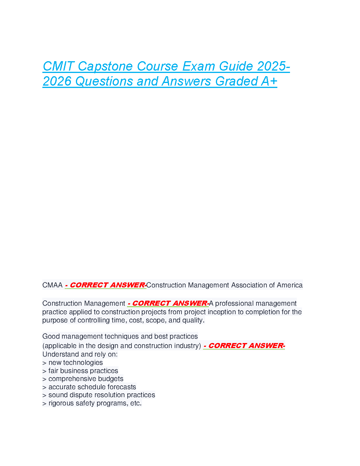 Prepare effectively for your CMIT Capstone Course Exam for the 2025-2026 academic year with this comprehensive study resource. Featuring meticulously compiled questions and expert-verified answers, this guide is specifically designed to help students achieve an A+ grade on their first attempt and confidently avoid resits. Master essential concepts in Construction Management, understand key CMAA definitions, and learn industry best practices including new technologies, fair business principles, comprehensive budgeting, accurate schedule forecasts, sound dispute resolution, and rigorous safety programs. This resource is your ultimate tool for ensuring exam success.