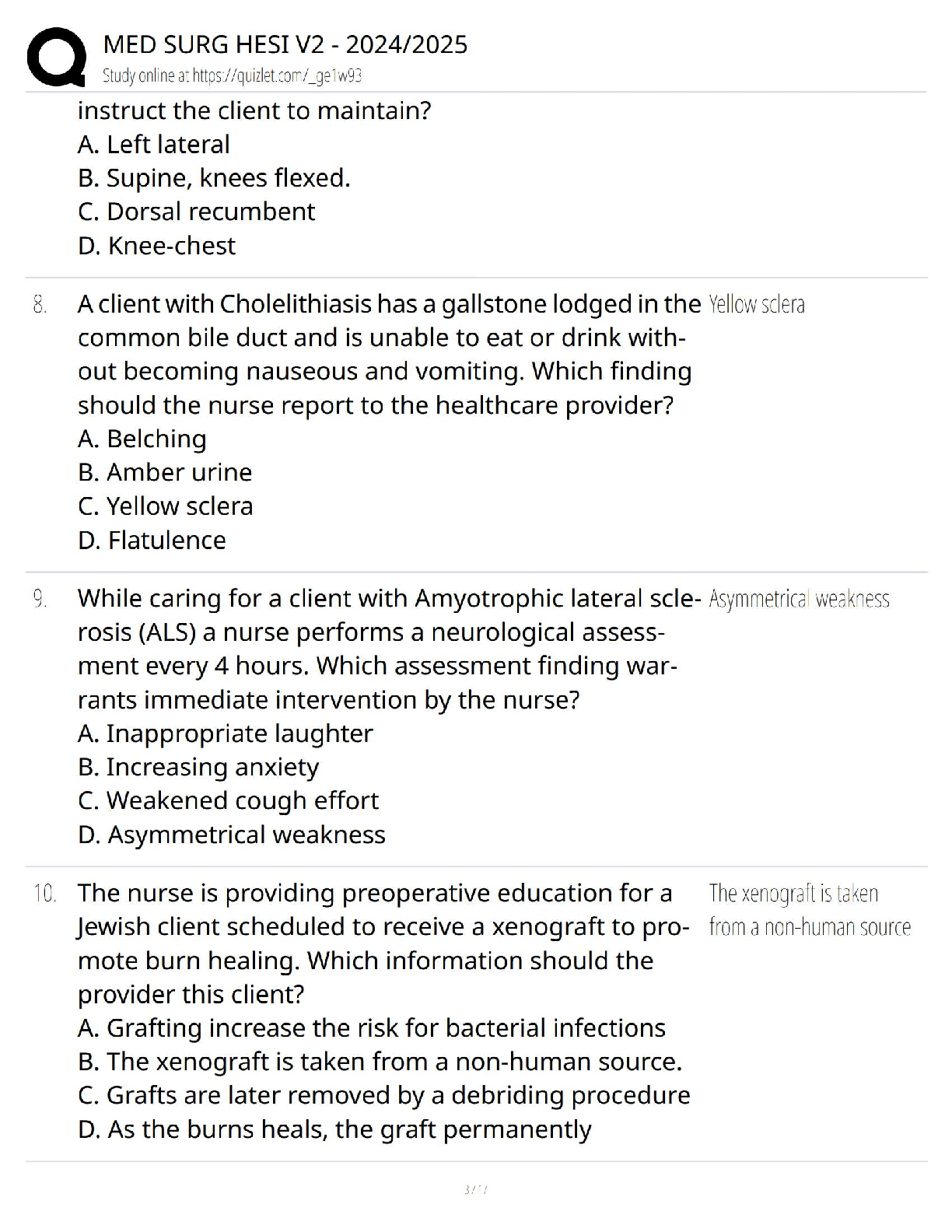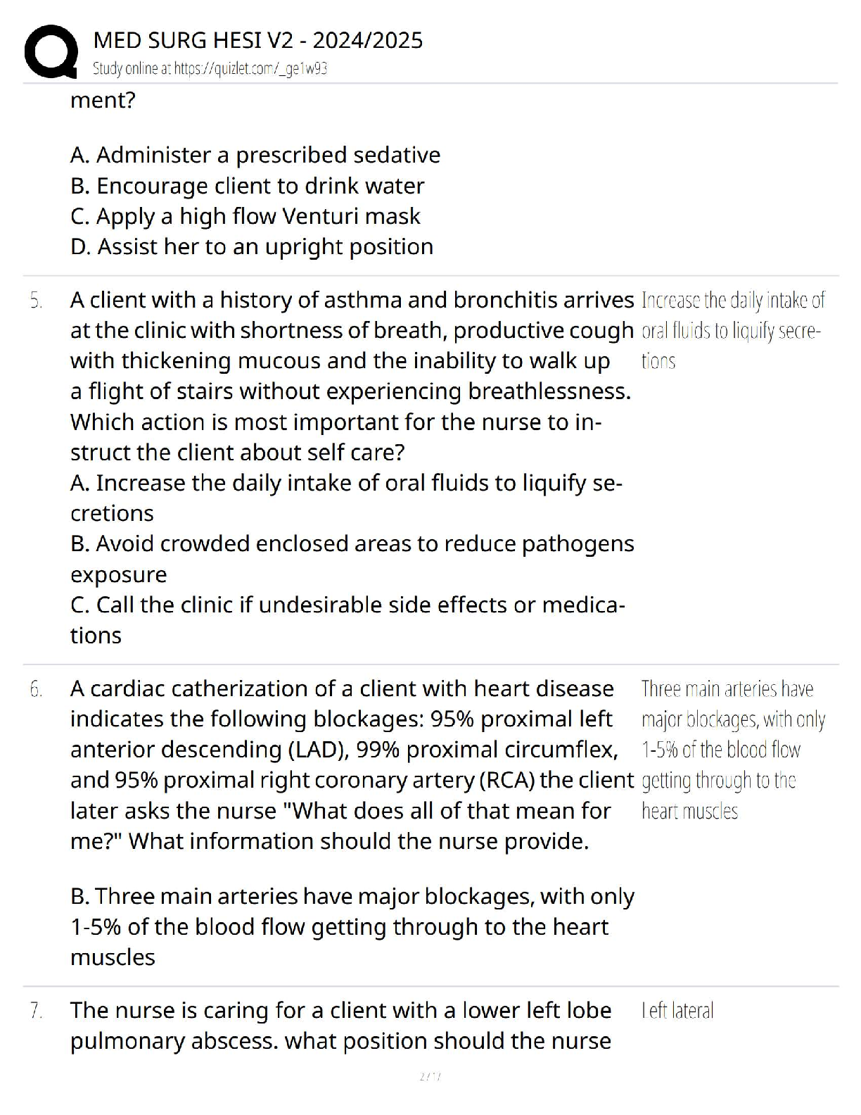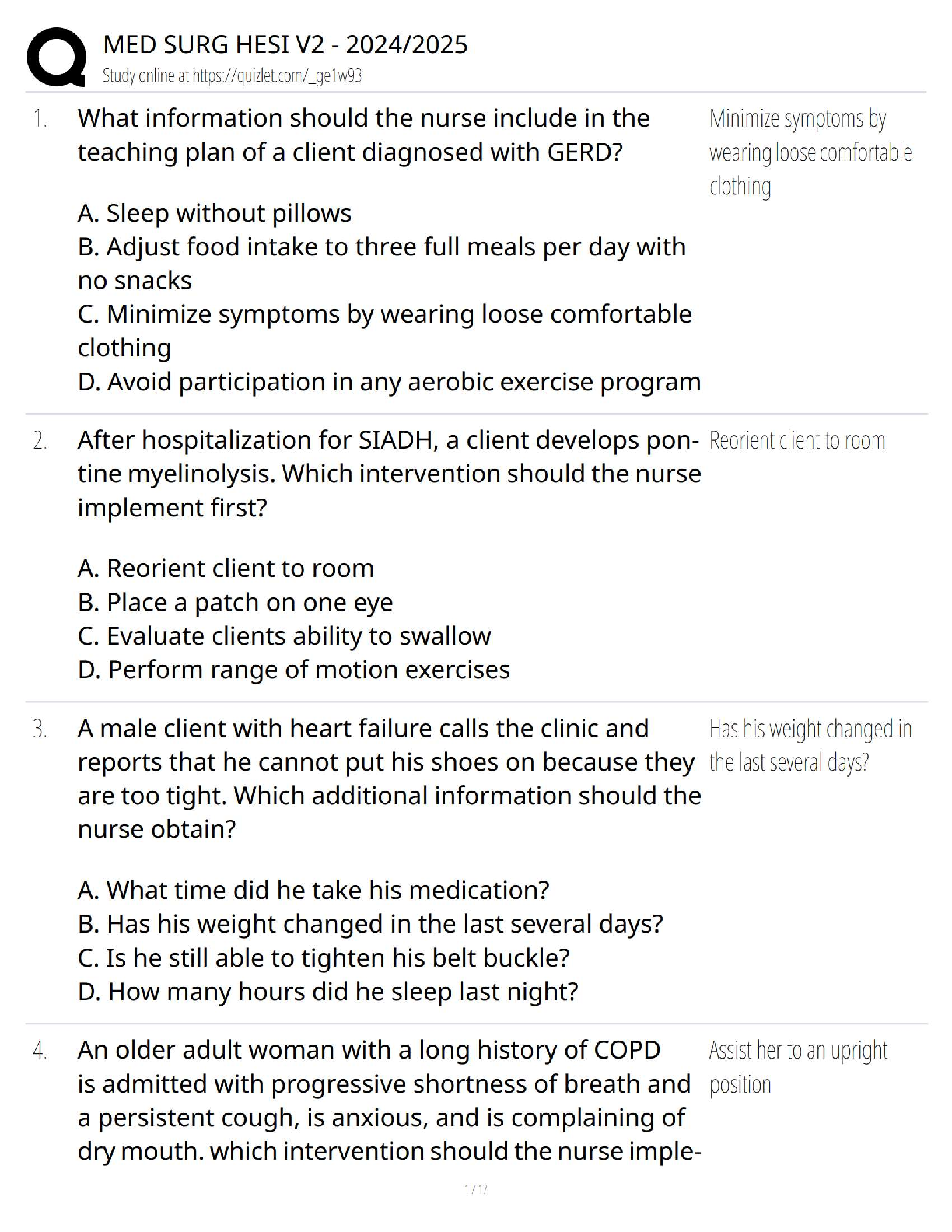 Achieve guaranteed success in your nursing studies with this cutting-edge HESI Medical-Surgical (Med Surg) V2 Exam Preparation resource, meticulously updated for the 2024/2025 academic year. Developed by Elsevier, this essential test bank provides robust practice questions, scenario-based challenges, and key concept reinforcement designed to solidify your understanding of critical Med Surg topics. Sharpen your clinical judgment, master complex care plans, and confidently approach your HESI exams. This material is strategically crafted to help you ace your exams on the very first try, saving you time and avoiding the need for costly resits.