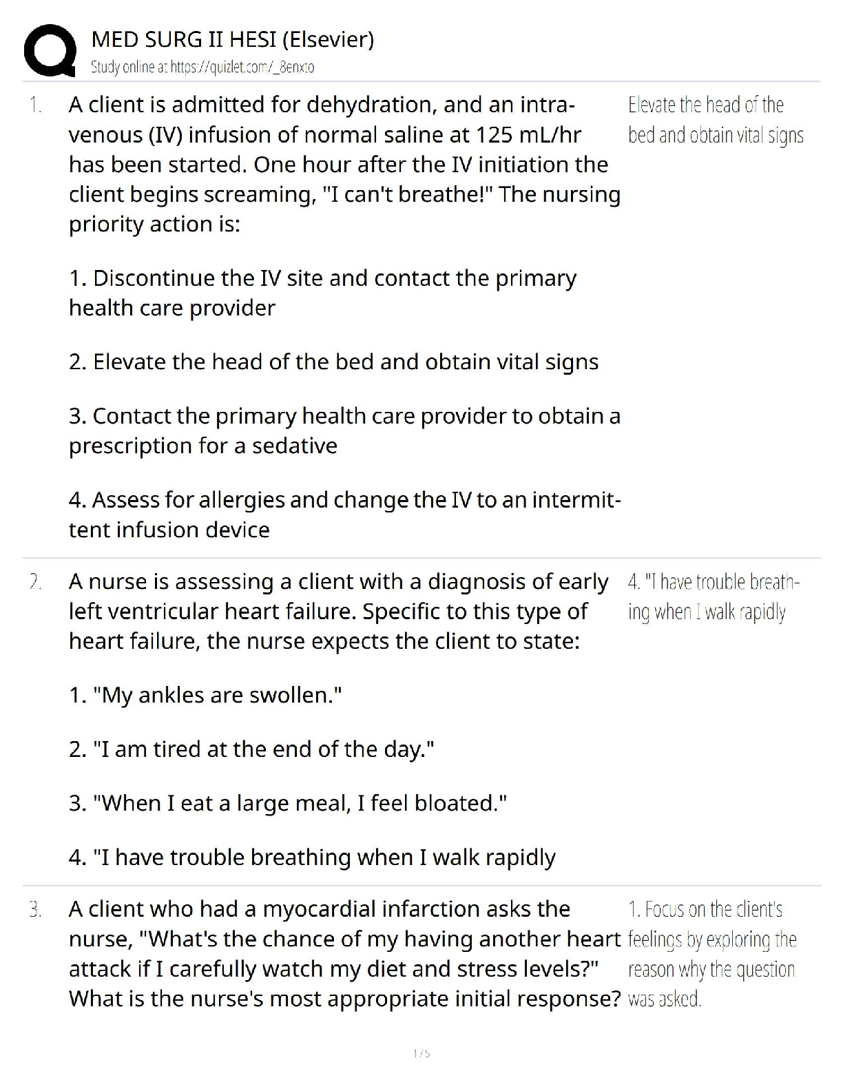 Unlock your full potential in Medical-Surgical Nursing II with this comprehensive HESI Test Bank and Study Guide, meticulously updated for the 2025/2026 academic year. Aligned with the expert knowledge found in the 11th Edition of 'Medical-Surgical Nursing: Concepts for Interprofessional Collaborative Care' by renowned authors Donna D. Ignatavicius, M. Linda Workman, Cherie R. Rebar, and Nicole M. Heimgartner (Elsevier), this essential resource provides practice questions and detailed rationales. Master critical nursing concepts, reinforce your understanding of complex medical conditions, and confidently prepare to pass your HESI Med Surg II exam on your first attempt, avoiding the need for costly resits. This collection features scenario-based questions covering vital topics such as fluid imbalances, heart failure, and post-myocardial infarction care, ensuring you are fully prepared for success.