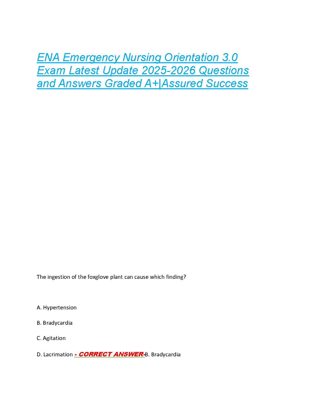 Master the ENA Emergency Nursing Orientation 3.0 exam with our comprehensive question and answer guide, updated for the 2025-2026 academic year. This resource is meticulously designed to help students achieve top scores and pass their exams on the first attempt, avoiding the need for resits. Featuring detailed explanations and a focused approach, it covers critical topics to ensure you are fully prepared. Pass your exams with confidence!