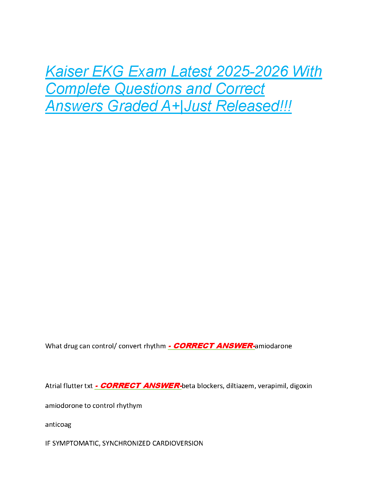 Prepare for your Kaiser EKG Exam with this newly released, comprehensive 2025-2026 test bank. This essential study aid features a collection of complete questions and meticulously verified, A+ graded answers, specifically designed to help students master EKG concepts and confidently pass their exam on the very first attempt. Avoid the stress and cost of resits by utilizing the most current and accurate practice material covering critical topics like rhythm control, atrial flutter, and synchronized cardioversion. Ideal for achieving academic excellence in the upcoming academic year.