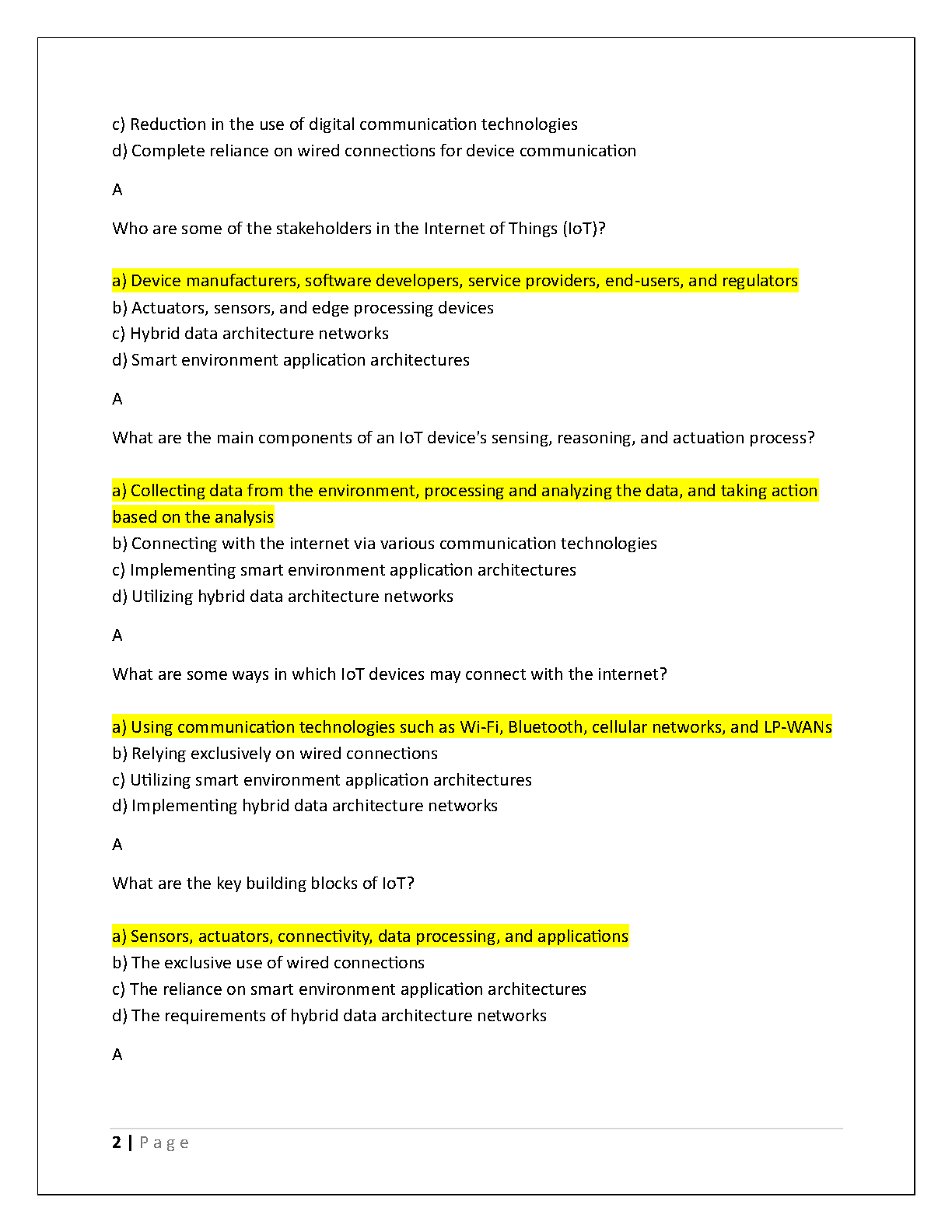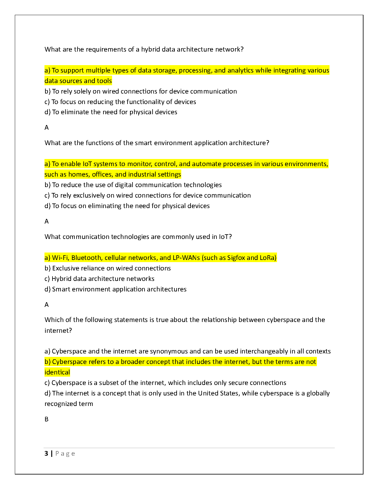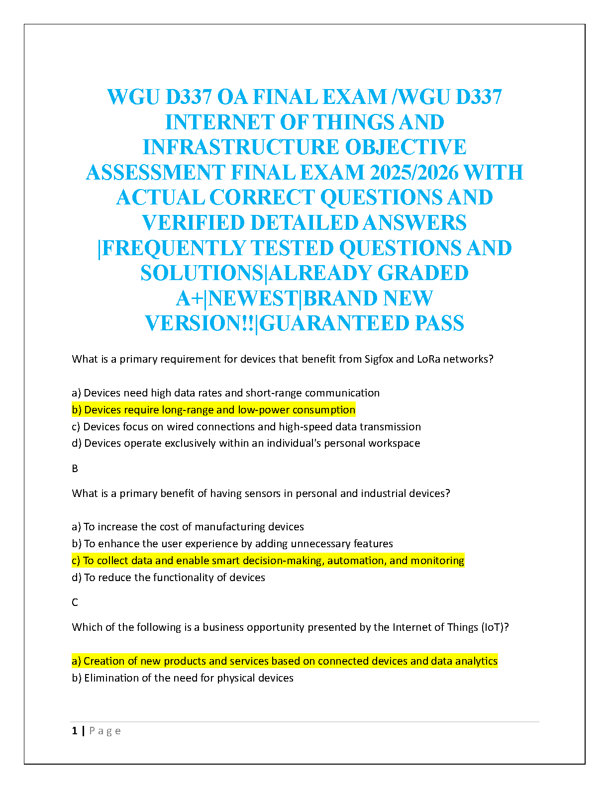 Unlock an A+ on your WGU D337 Internet of Things and Infrastructure Objective Assessment Final Exam (OA) for the 2025/2026 academic year. This meticulously compiled test bank offers a comprehensive collection of frequently tested questions with thoroughly verified detailed answers and step-by-step solutions. Designed to maximize your understanding and exam readiness, this brand-new resource is your ultimate guide to mastering IoT and infrastructure concepts, ensuring you pass your final exam on the very first attempt and confidently avoid any resits. Prepare smarter, achieve higher grades, and succeed with confidence.