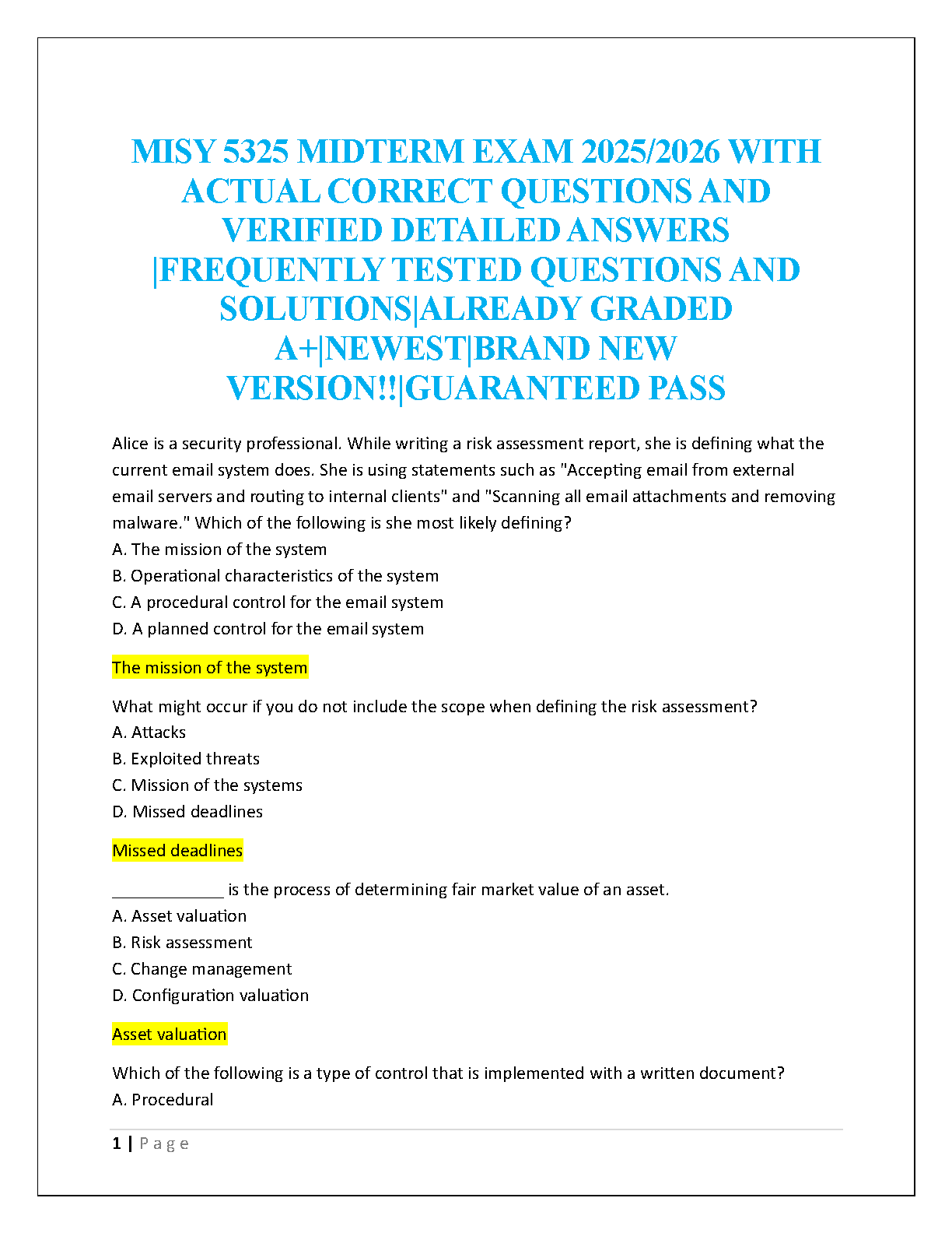 This brand new, comprehensive test bank for the MISY 5325 Midterm Exam (2025/2026 academic year) features actual and frequently tested questions. It comes with verified correct answers and detailed explanations, meticulously designed to help students achieve an A+ grade and pass their exams on the very first attempt, effectively avoiding costly resits. An essential resource for in-depth study and robust exam readiness.