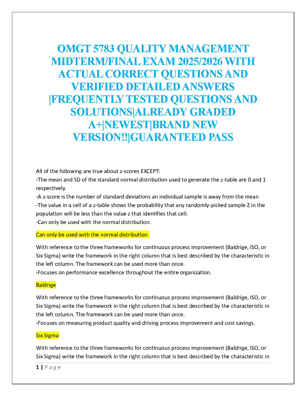 Unlock unparalleled exam success for OMGT 5783 Quality Management during the 2025/2026 academic year with this comprehensive Midterm and Final Exam Test Bank. This brand-new, A+-graded resource features actual, frequently tested questions alongside meticulously verified, detailed solutions, ensuring you're fully prepared. Master critical concepts such as z-scores, the Baldrige framework, and Six Sigma through practice that guarantees a deep understanding. Designed to help students pass their exams on the very first attempt and avoid costly resits, this newest version provides the most current and relevant material for optimal academic performance and a guaranteed pass.