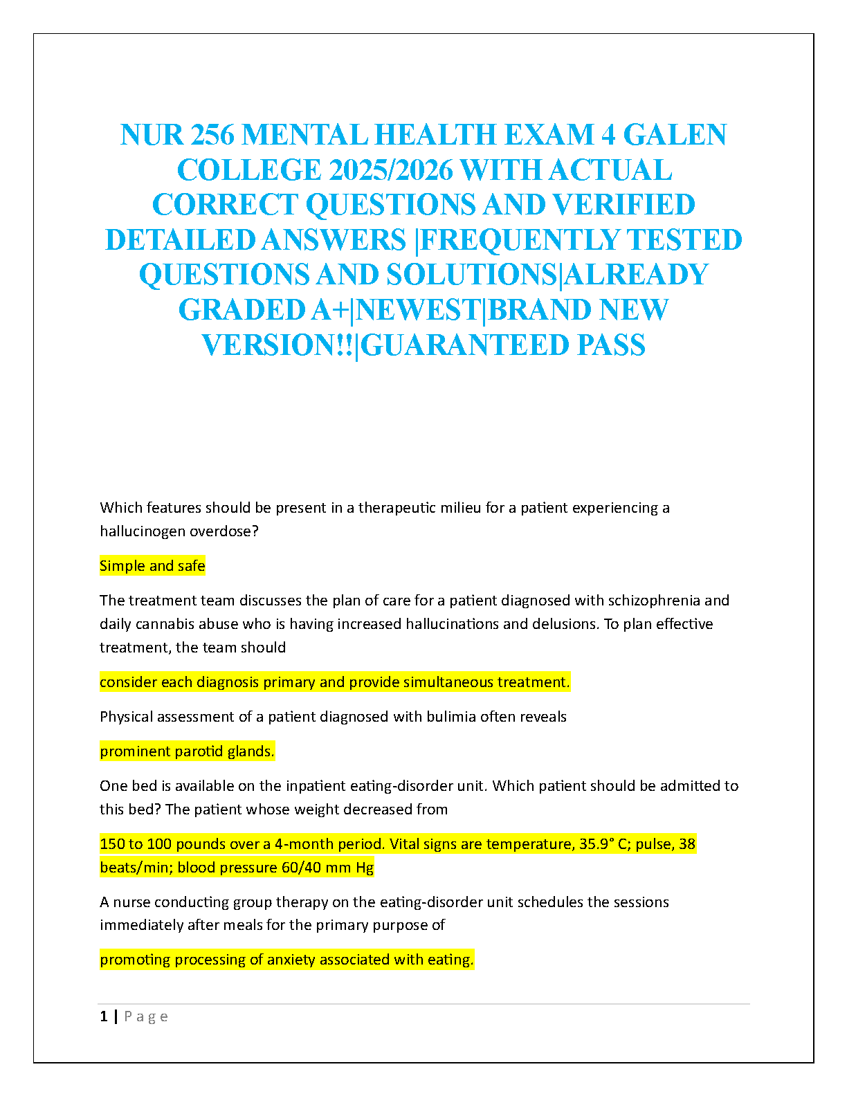 Ace your Galen College NUR 256 Mental Health Exam 4 with this ultimate 2025/2026 academic year test bank. Designed for guaranteed success, this resource features actual, frequently tested questions and problems, complete with thoroughly verified, detailed answers and step-by-step solutions. Prepare effectively by mastering critical mental health nursing concepts, ensuring you pass your exams on the first attempt and achieve an A+ grade. This brand new, comprehensive study aid is your key to excelling in your Mental Health Nursing course and avoiding resits.