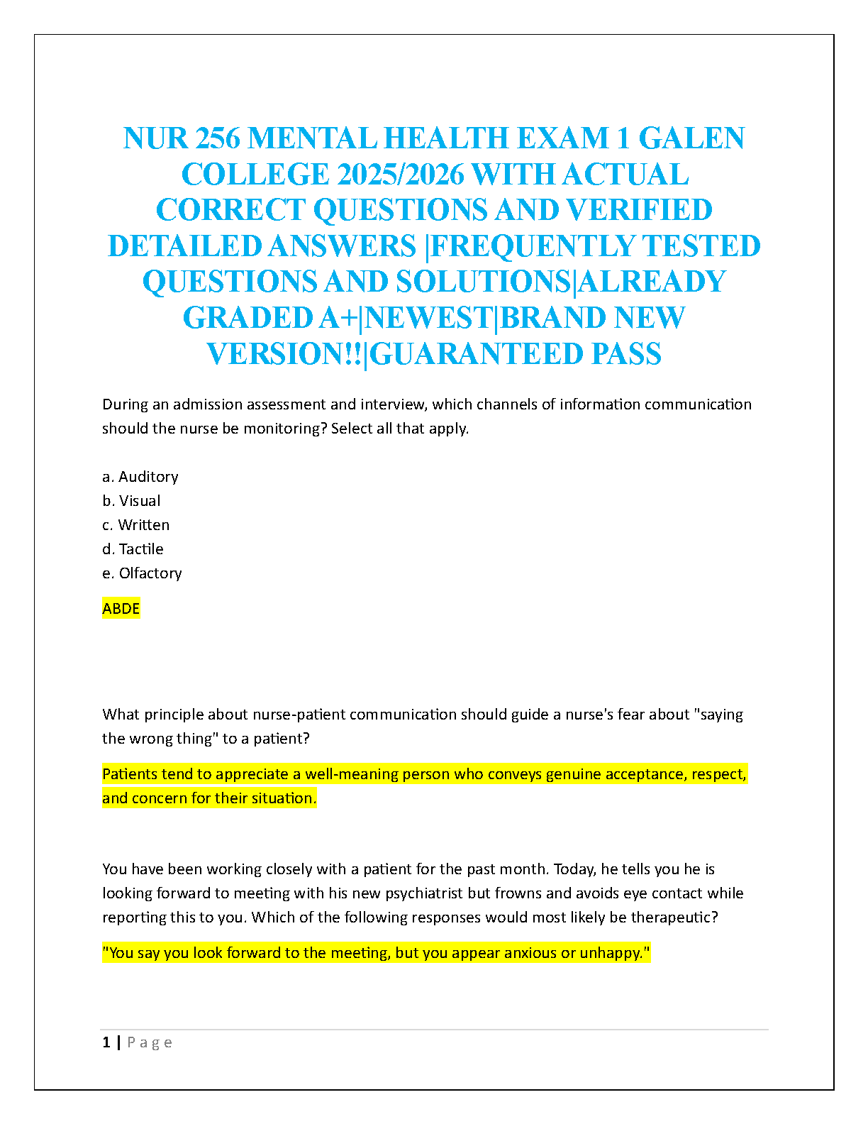 Prepare to excel in your NUR 256 Mental Health Exam 1 at Galen College with this comprehensive and up-to-date test bank for the 2025/2026 academic year. This essential study resource provides actual exam questions, thoroughly verified answers, and detailed explanations to foster deep understanding of critical concepts. Designed to equip you with frequently tested questions and their solutions, this brand-new version is your ultimate tool to secure an A+ grade on your first attempt, helping you confidently pass your exams and avoid any resits in mental health nursing.