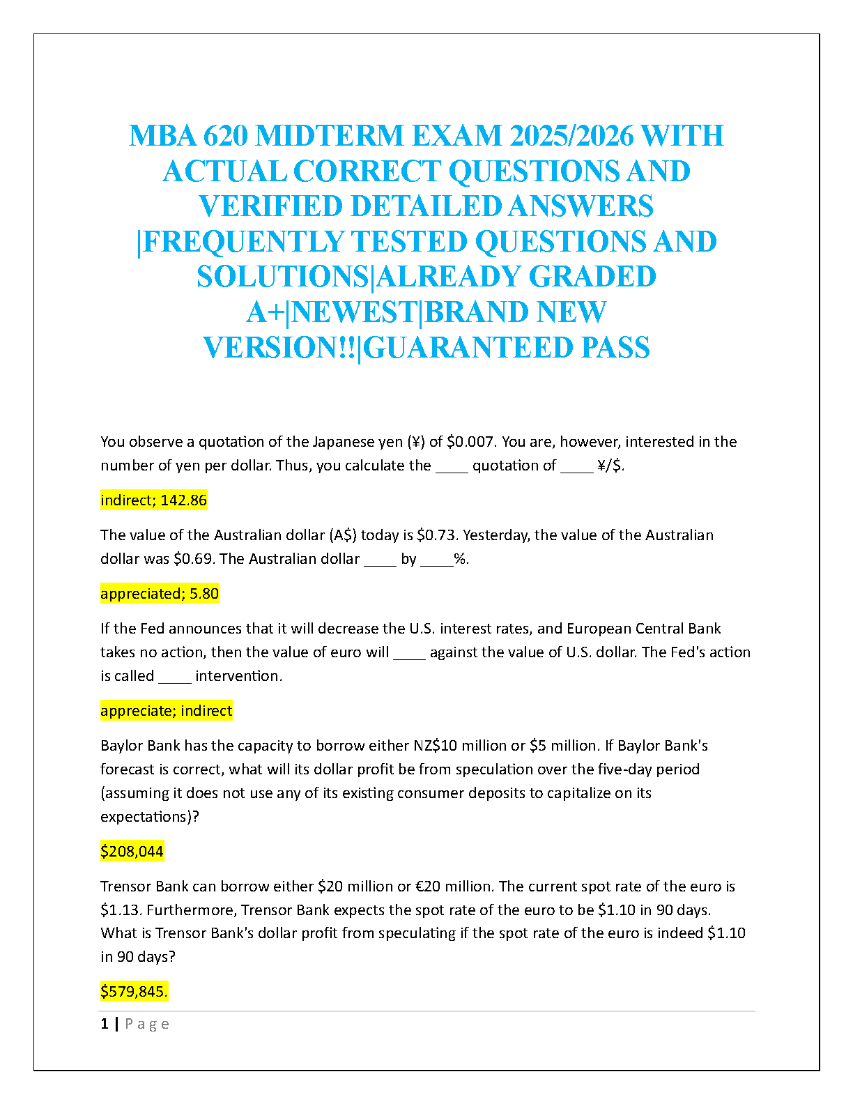Maximize your chances of academic success with our exclusive MBA 620 Midterm Exam Test Bank for the 2025/2026 academic year. This meticulously crafted resource features actual, frequently tested questions and scenarios, coupled with thoroughly verified, step-by-step detailed answers and solutions. Engineered for students aiming for an A+ on their first attempt, it provides an unparalleled advantage for mastering core concepts and avoiding costly resits. This brand-new version is your ultimate preparation tool to confidently excel in your MBA 620 midterm and achieve academic excellence.
