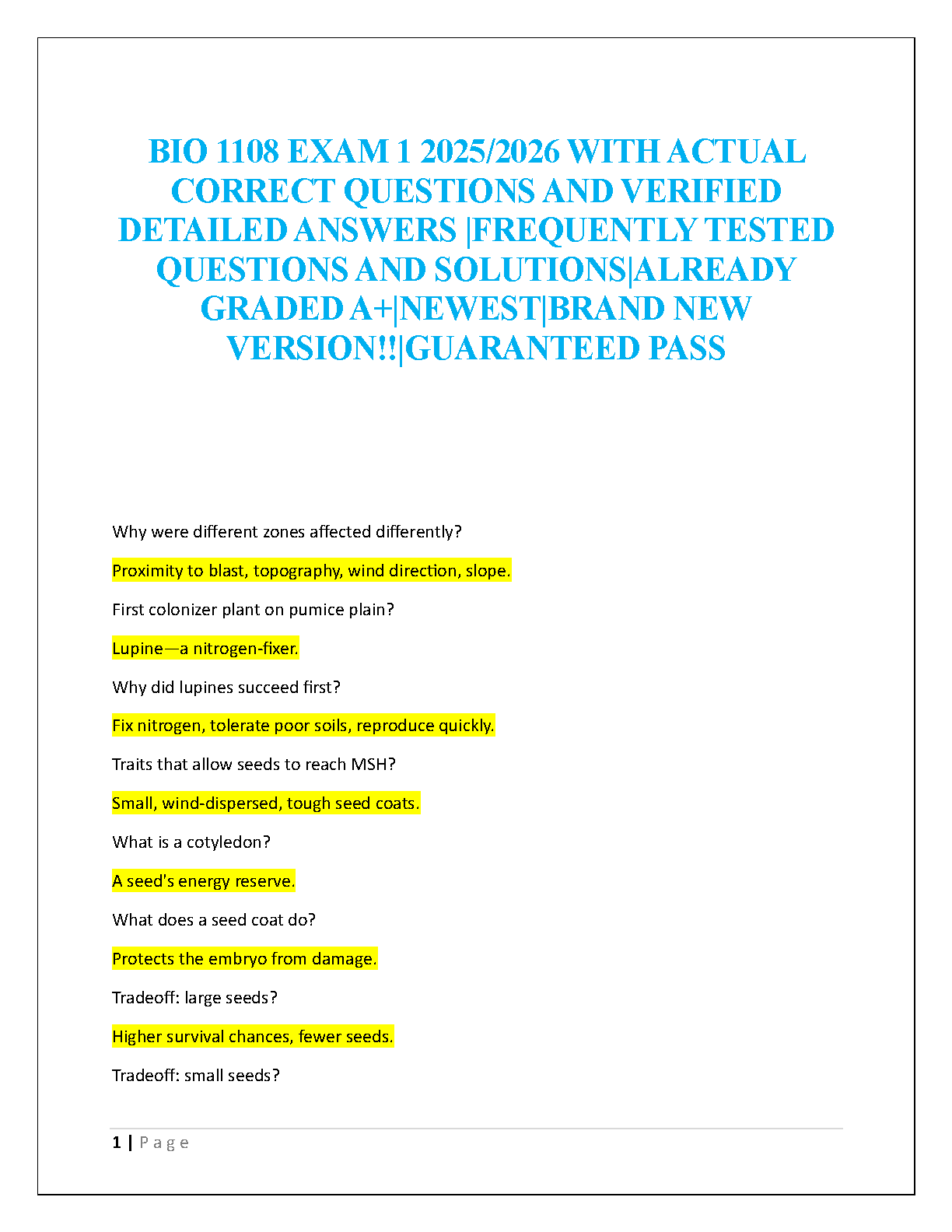 Elevate your performance in BIO 1108 Exam 1 with this comprehensive 2025/2026 Test Bank. Featuring actual, frequently tested questions and meticulously verified, detailed answers, this brand-new resource is expertly designed to ensure you achieve an A+ and pass on your very first attempt, eliminating the need for costly resits. Master crucial biological concepts with the most current and relevant study material, giving you the ultimate edge in excelling in your course.