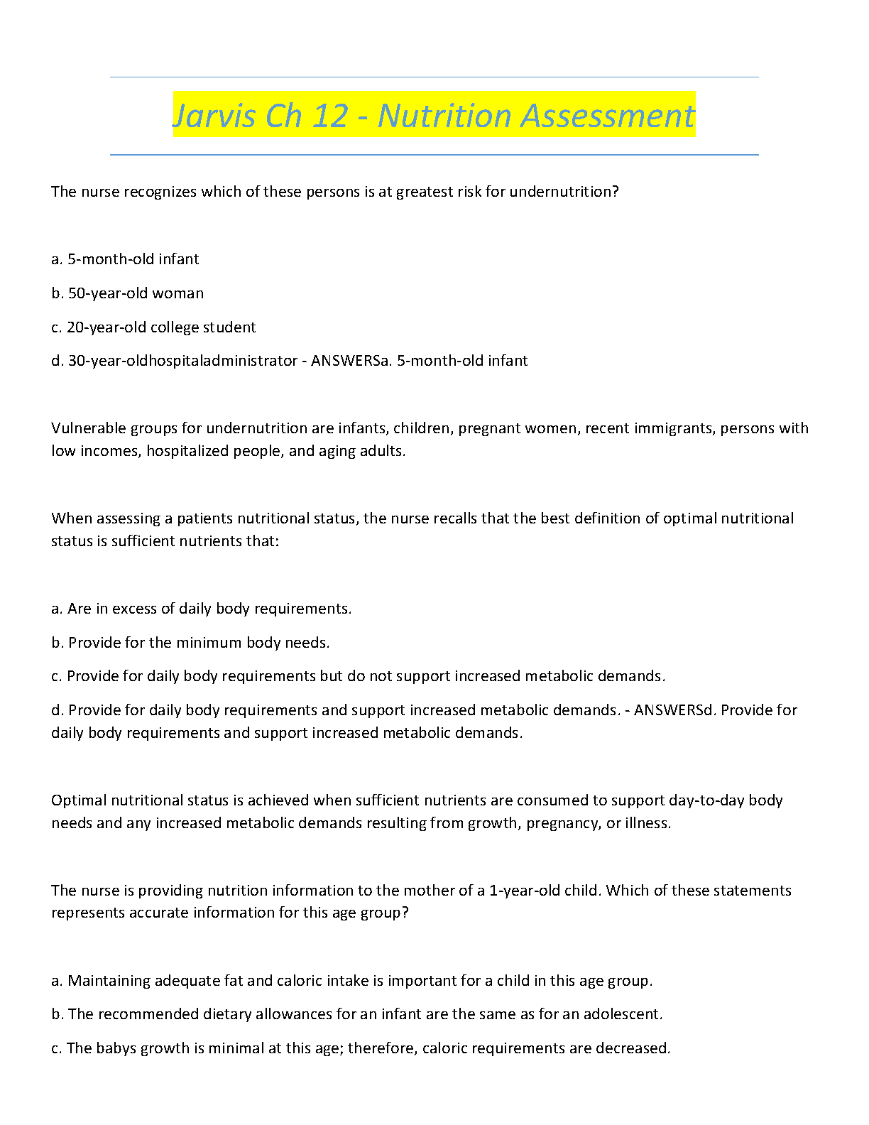 Test Bank for Jarvis's Physical Examination & Health Assessment, 9th Edition by Carolyn Jarvis, Ann L. Eckhardt, and Denise A. S. D'Amico - Chapter 12: Nutrition Assessment