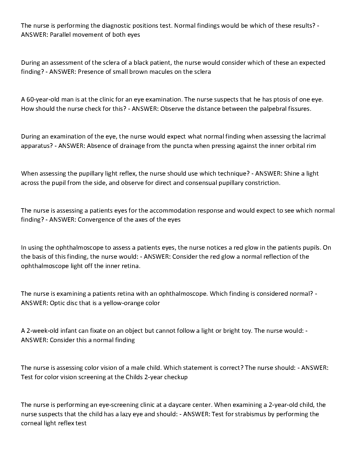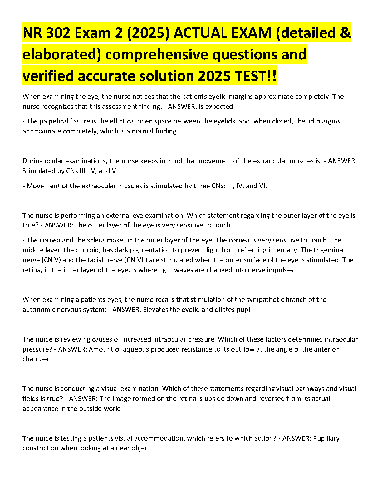 Ace your NR 302 Health Assessment Exam 2 with our comprehensive 2025/2026 test bank! This guide provides a curated collection of exam-style questions and detailed, verified answers based on 'Health Assessment in Nursing' by Weber & Kelley. Master critical topics including ocular examinations, cranial nerve function, intraocular pressure, and visual pathways. Designed to help you understand complex concepts and pass your exam on the first attempt, this study aid is your ultimate tool for success, ensuring you avoid resits and achieve top grades.