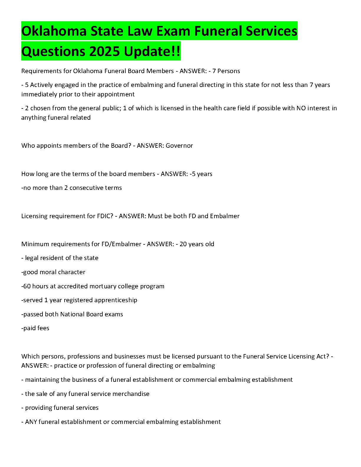 Oklahoma State Law Exam for Funeral Services Test Bank 2025: Comprehensive Q&A Study Guide