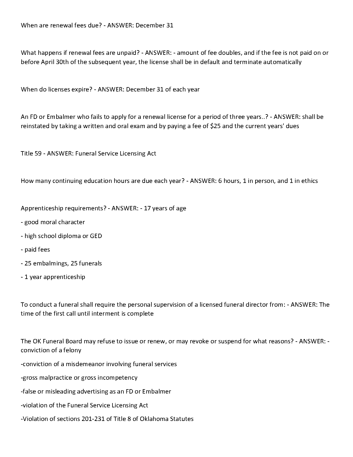 Ace your Oklahoma State Law Exam for Funeral Services on the first try with our comprehensive 2025 test bank. This essential study guide features a complete set of updated questions and detailed answers, covering all critical topics from the Oklahoma Funeral Service Licensing Act. Prepare effectively by mastering key concepts such as board member requirements, licensing procedures for Funeral Directors and Embalmers (FD/Embalmer), and professional regulations. Our Q&A format is designed to help you study efficiently and pass your licensure exam with confidence.