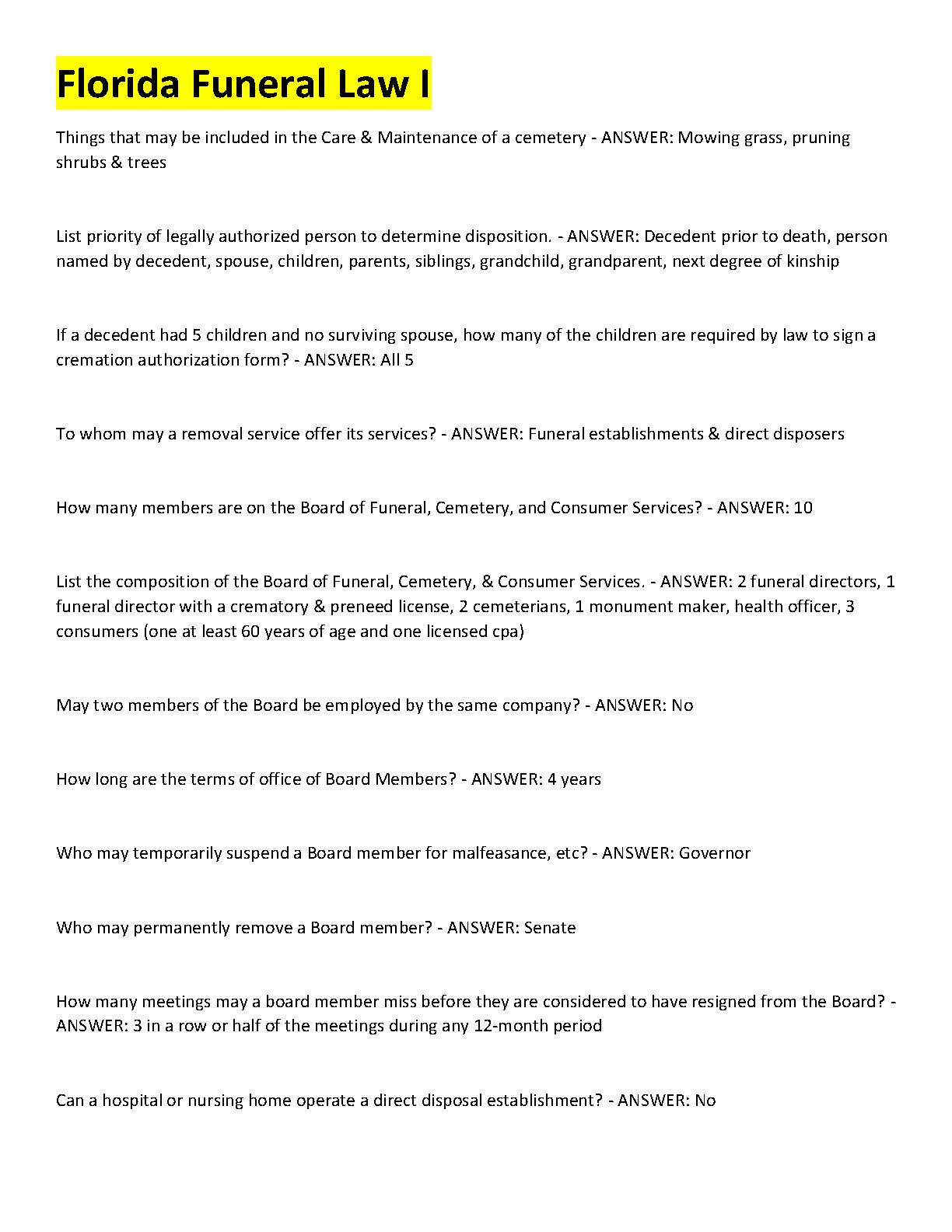 Florida Funeral Law I: Complete Q&A Exam Elaboration for 2025/2026 | First-Attempt Pass Guaranteed