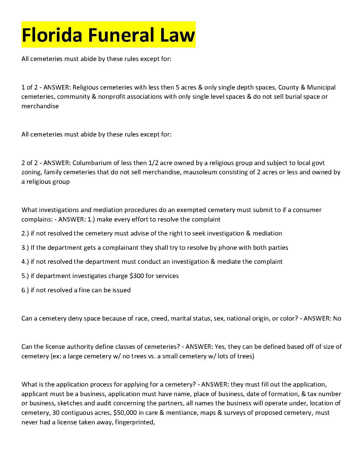 Master the complexities of Florida's funeral and cemetery regulations with our expertly crafted 2025/2026 Exam Elaboration. This comprehensive Q&A study guide delivers clear, direct answers to pivotal exam questions, covering essential topics such as cemetery rules, consumer complaint procedures, anti-discrimination laws, and the full application process. Specifically designed to help you ace the exam on your first attempt, this resource is your key to success. Stop stressing and start studying smart to avoid resits and confidently launch your career in funeral services.