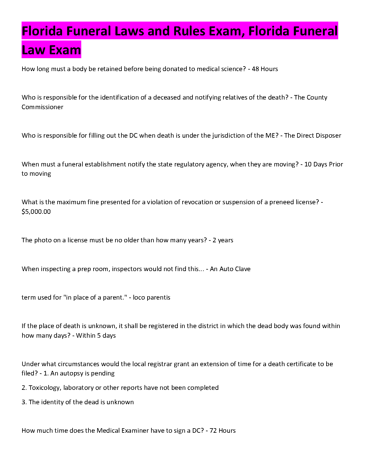 Florida Funeral Laws and Rules Exam Test Bank 2025/2026 | Comprehensive Q&A Study Guide to Pass Your Exam