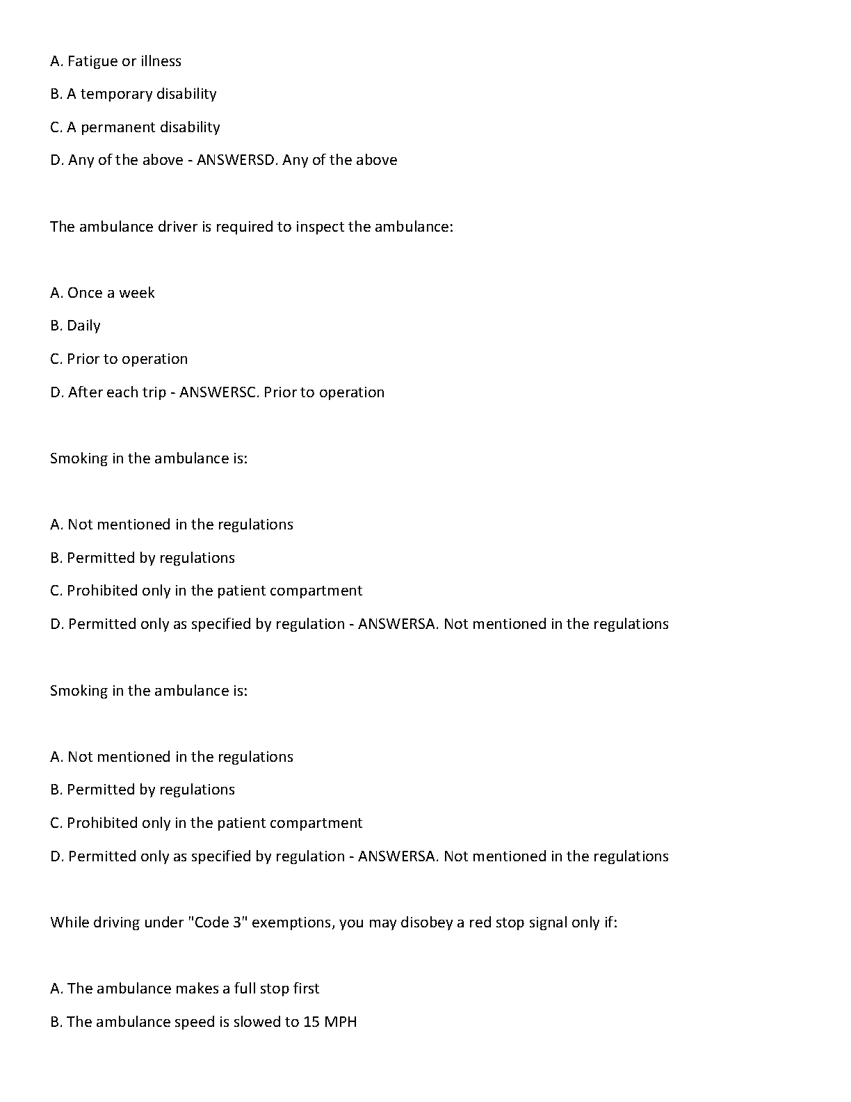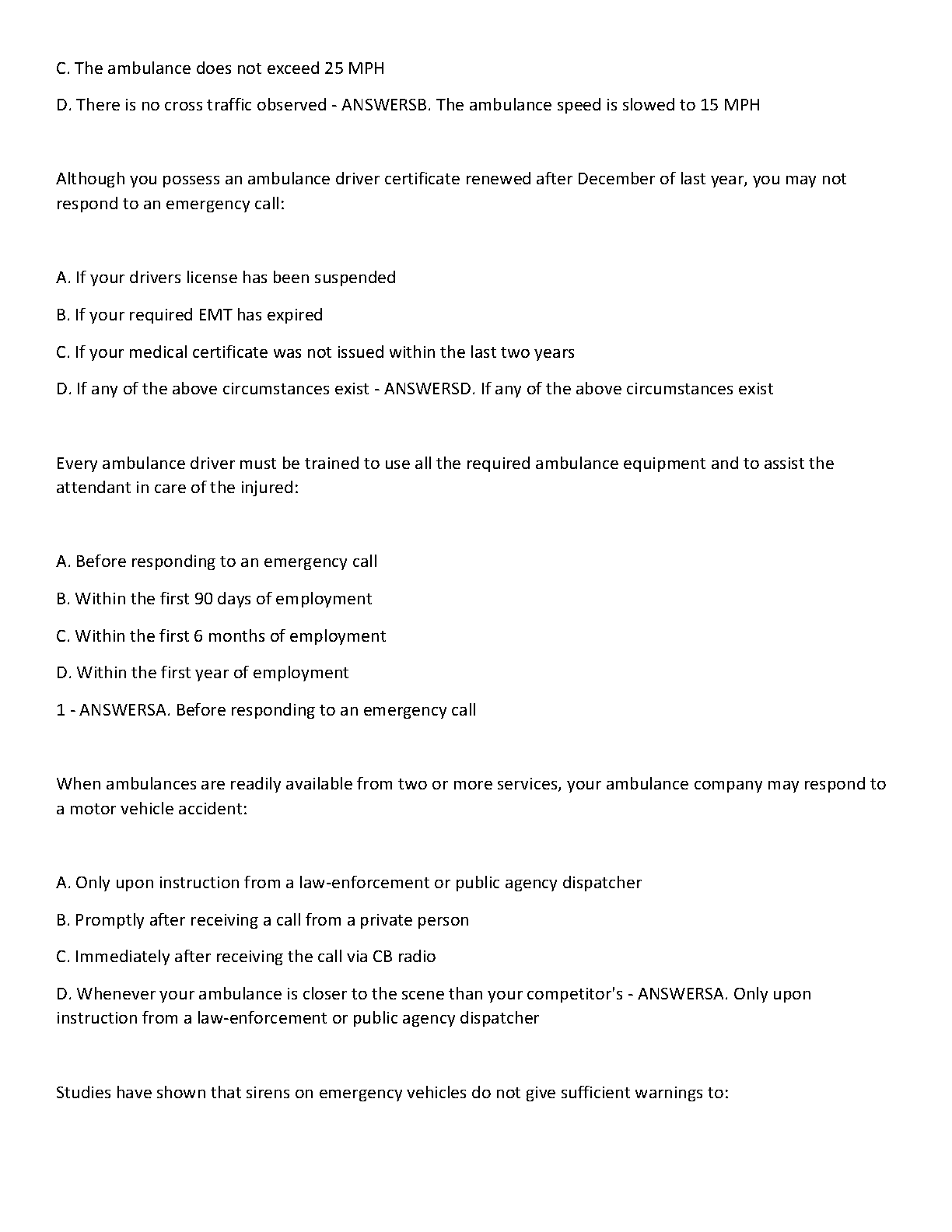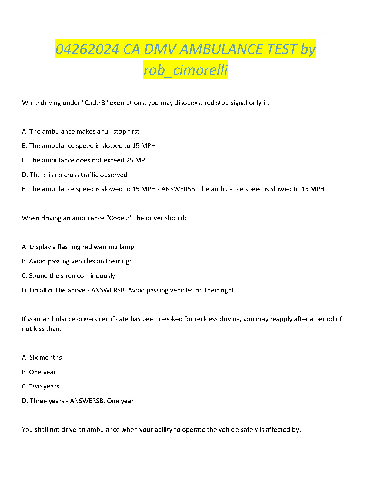 Get fully prepared for your California DMV Ambulance Driver exam with this comprehensive test bank for 2024, compiled by Rob Cimorelli. This essential study guide features a complete set of practice questions that mirror the official test format. Each question comes with a detailed, verified answer to ensure you understand the material thoroughly. Master key topics like 'Code 3' operations, traffic laws, and safety procedures. Ace your exam on the first try and secure your ambulance driver certificate with confidence using this up-to-date resource.