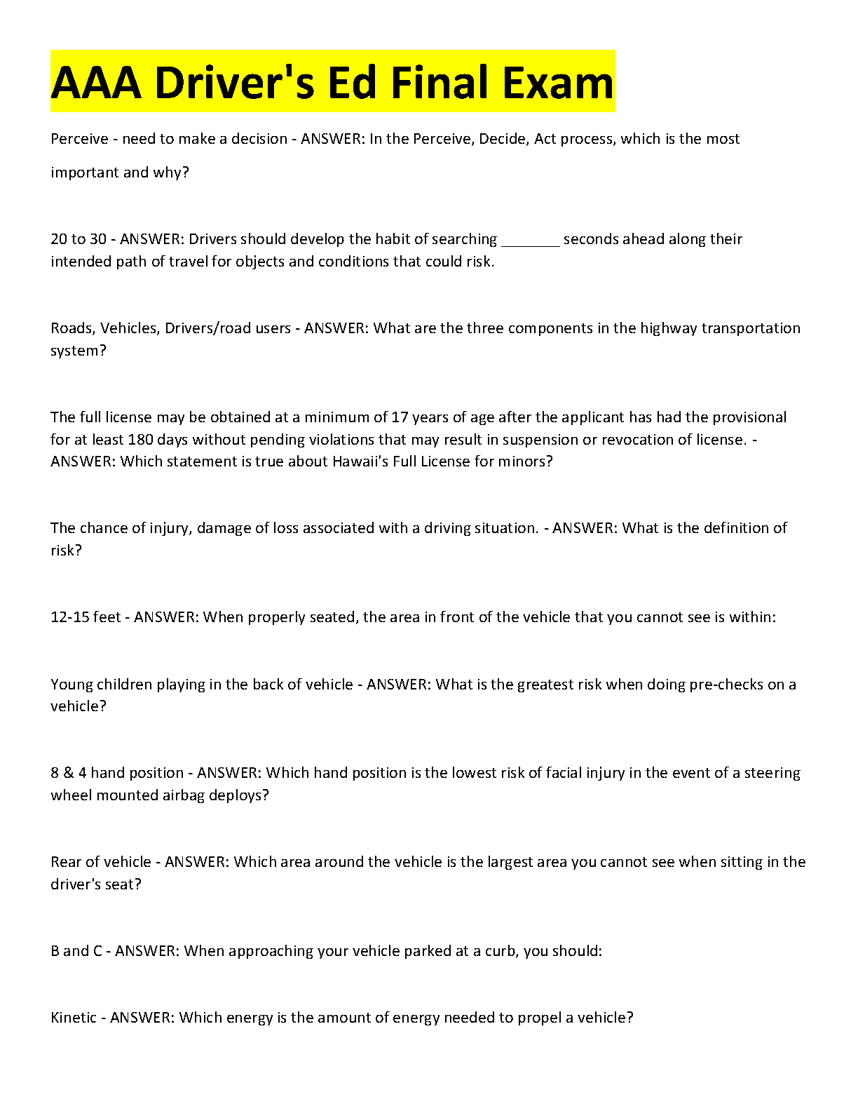 Unlock your driving potential with our premier AAA Driver's Education Final Exam Test Bank, fully updated for the 2025/2026 academic year. This essential study guide provides a complete collection of real exam questions and verified answers, meticulously designed to help you master every topic. From the Perceive-Decide-Act process and vehicle safety checks to traffic laws and risk management, this resource covers it all. Prepare effectively, build your confidence, and ensure you pass your final exam on the first try, avoiding any need for resits. Get on the road to success today!