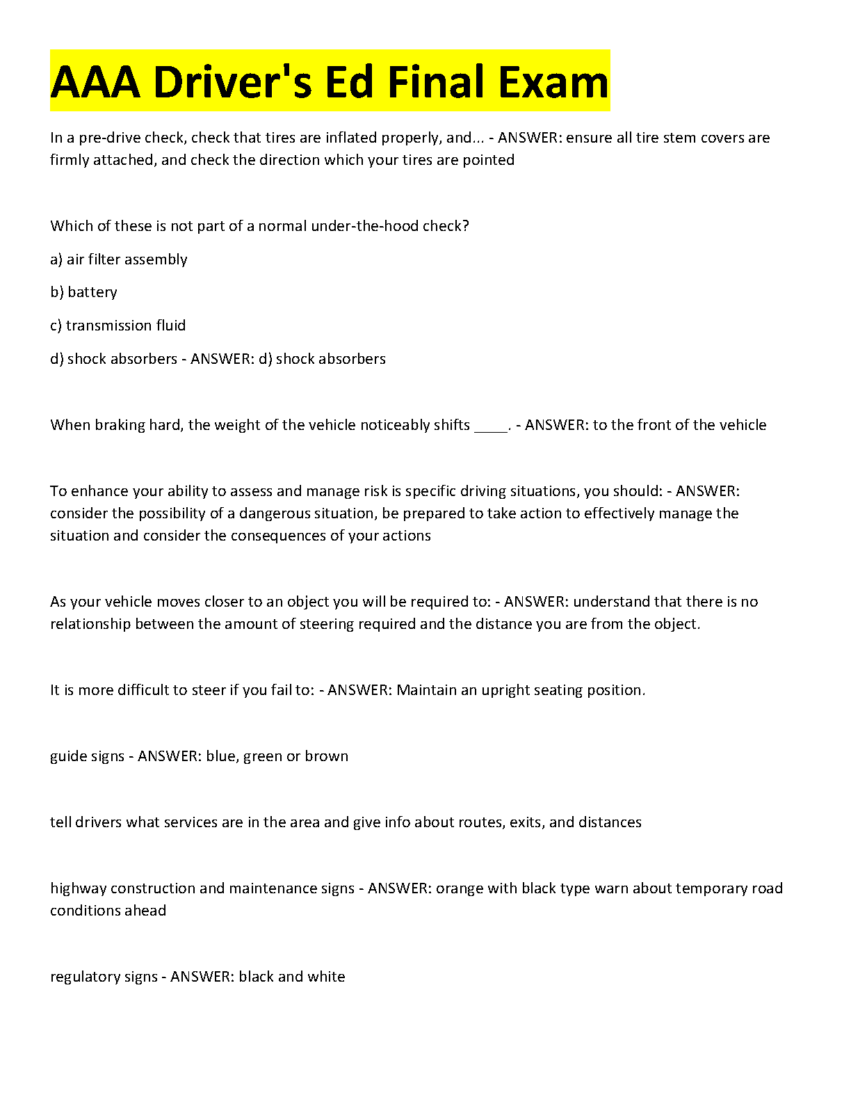 Unlock your driving freedom with our comprehensive 2025/2026 study guide for the AAA Driver's Ed Final Exam. This essential resource is designed to help you master all the critical topics and pass your test on the very first try, eliminating the stress of resits. Inside, you'll find a complete collection of meticulously verified questions and answers covering everything from pre-drive safety checks and under-the-hood knowledge to understanding road signs, vehicle dynamics, and crucial risk management techniques. Prepare with confidence and get on the road faster with this ultimate exam preparation tool.