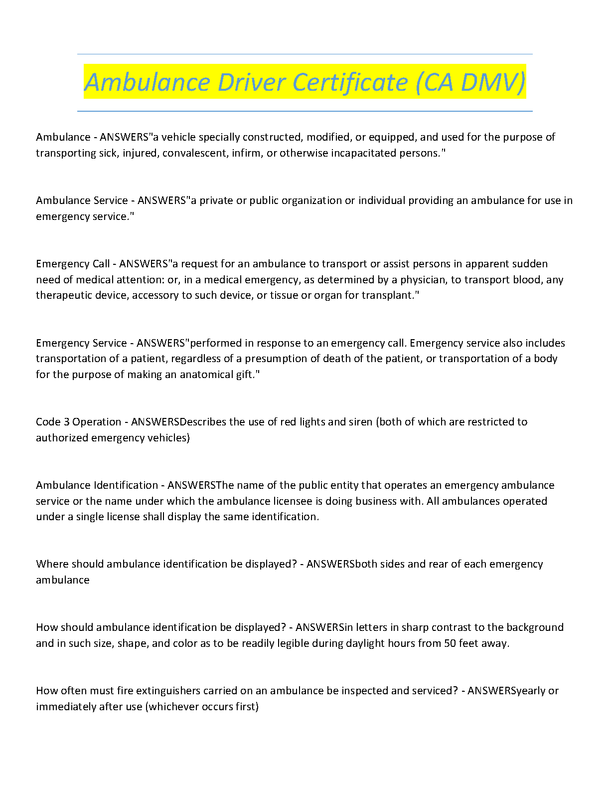 Ace your California Ambulance Driver Certificate exam with our updated 2025/2026 test bank. This comprehensive study guide provides a complete set of questions and answers covering all essential topics required by the CA DMV. From critical definitions like 'Ambulance Service' and 'Emergency Call' to operational procedures such as 'Code 3 Operation' and vehicle regulations, we've got you covered. Our straightforward Q&A format is expertly designed to help you study efficiently, master the material, and pass your certification test on the very first attempt. Get instant access and start preparing to become a certified ambulance driver today!