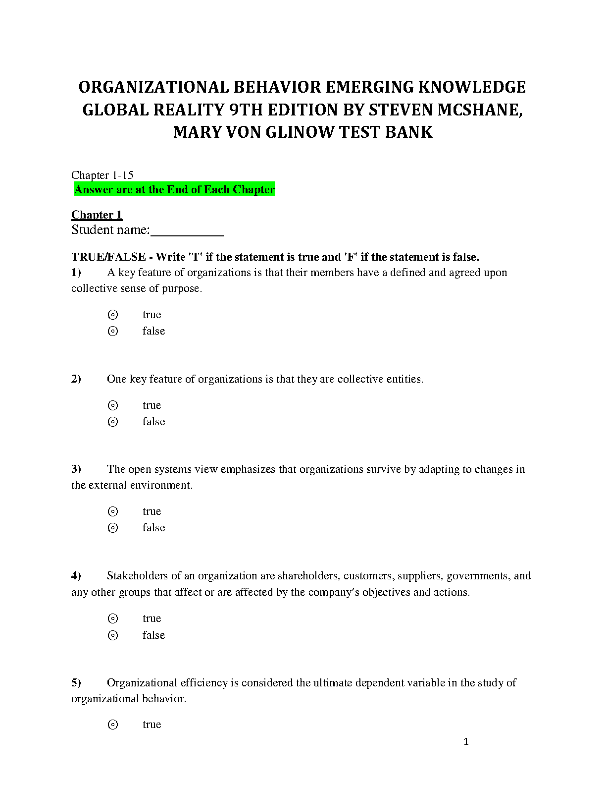 Organizational Behavior, 9th Edition by McShane & Von Glinow - Official Test Bank