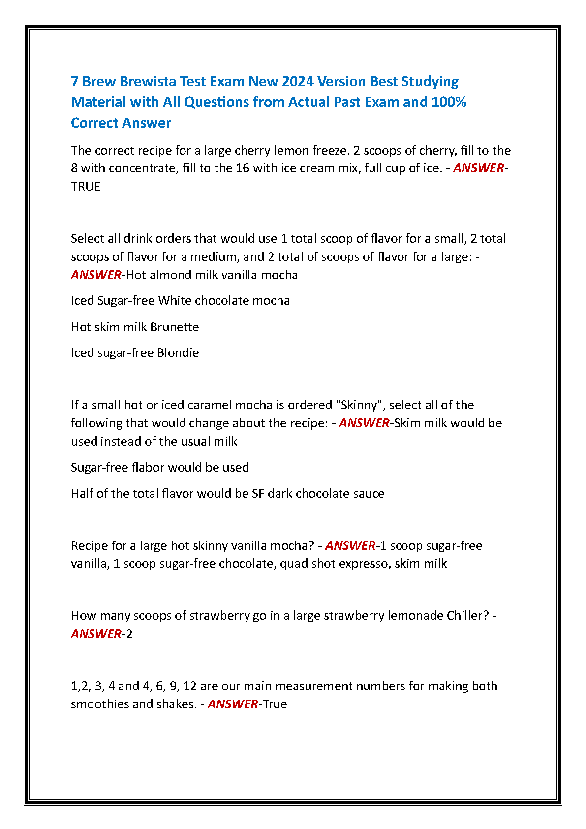 Prepare to ace your 7 Brew Brewista certification with our latest 2024 test bank. This comprehensive study guide is packed with real questions from the actual exam, each accompanied by a 100% correct and verified answer. Master everything from drink recipes and ingredient proportions to handling special orders like a pro. This essential resource is designed to help you pass your Brewista test confidently on your first attempt. Download now to start your journey to becoming a certified 7 Brew Brewista!