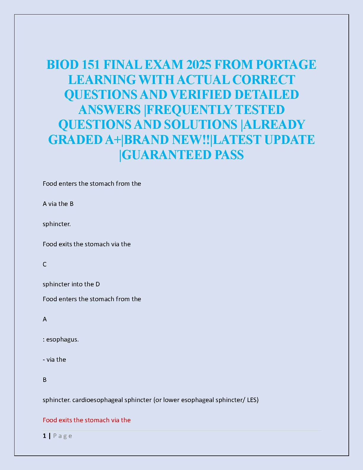 Ace your BIOD 151 Final Exam from Portage Learning with our latest 2025/2026 test bank. This comprehensive resource is packed with frequently tested questions and meticulously verified, detailed answers to ensure you have the most accurate study material. Already proven to achieve A+ grades, this guide is your key to mastering the course content and passing your final exam with confidence on the first attempt. Download now for a guaranteed path to success and avoid any resits!
