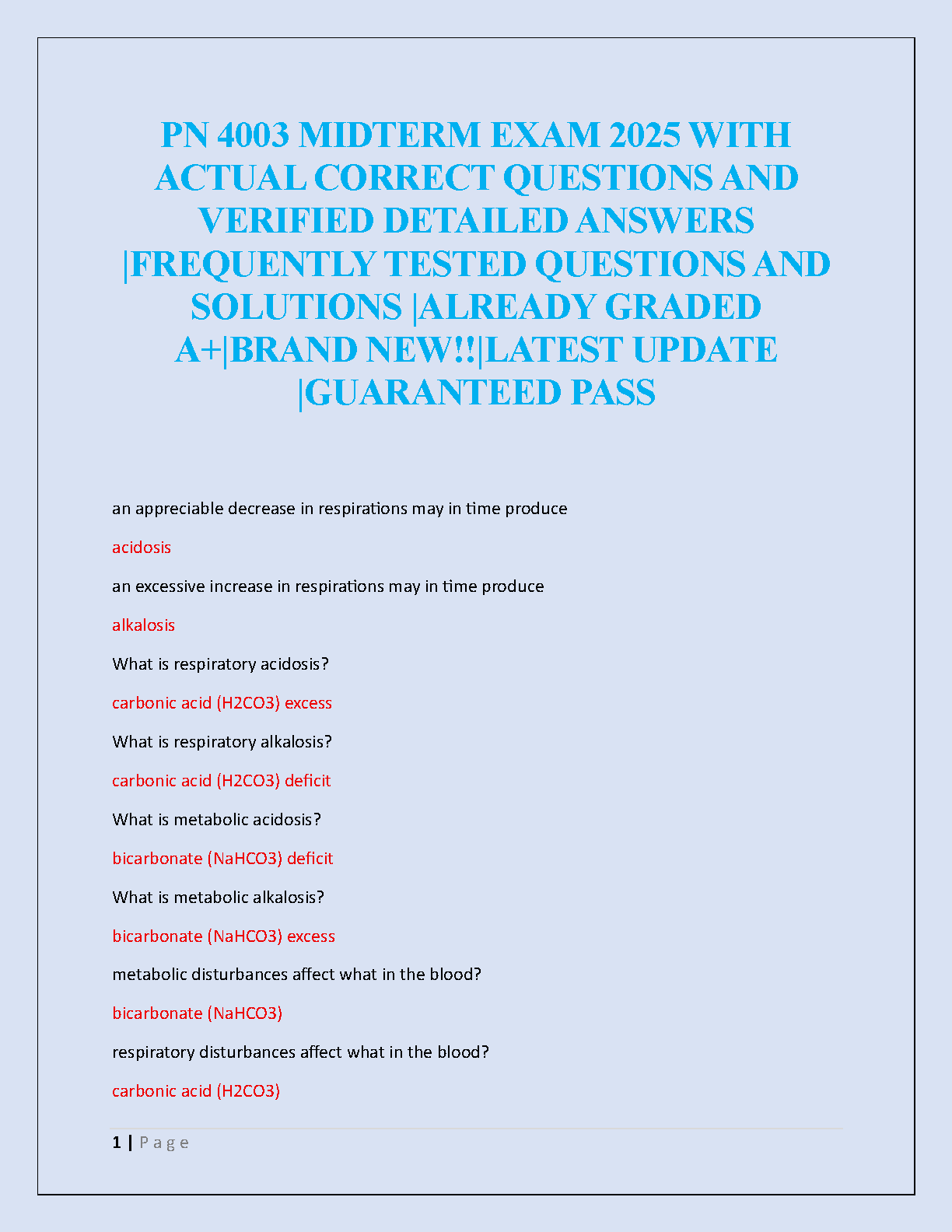 Unlock academic success with our comprehensive study guide for the PN 4003 Midterm Exam, fully updated for the 2025/2026 academic year. This resource is packed with a curated collection of frequently tested questions and meticulously verified, detailed answers, covering key topics like respiratory and metabolic acidosis/alkalosis. Designed to help you ace your exam, this guide provides A+ graded solutions, ensuring you grasp complex concepts and are fully prepared to pass on your very first try. Avoid resits and study smarter with this brand new, guaranteed-to-pass resource.