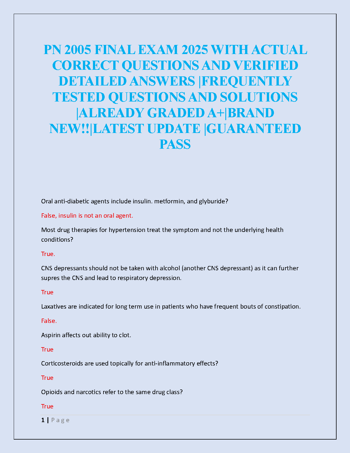 Prepare to ace your PN 2005 Final Exam with our expertly crafted 2025 Test Bank. This comprehensive study guide features a complete collection of actual exam questions, each with a verified and detailed answer. Sourced from the latest curriculum, this resource is already A+ graded and is designed to cover all the frequently tested concepts you'll encounter. Master the material, study efficiently, and walk into your exam with the confidence to pass on your first try. Get the latest update and guarantee your success in PN 2005!