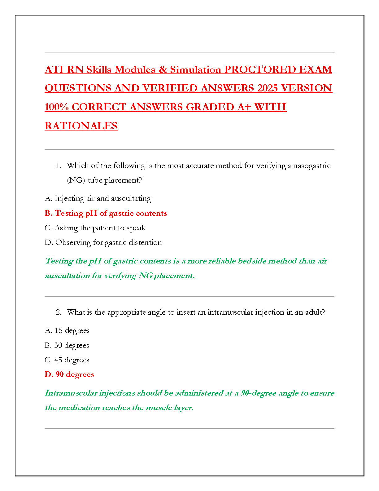 Ace your ATI RN Skills Modules & Simulation Proctored Exam with this ultimate 2025/2026 study guide. This comprehensive test bank features an extensive collection of proctored exam questions, each paired with a verified, 100% correct answer and a detailed rationale. Understand the 'why' behind each answer to solidify your knowledge on crucial nursing skills. Designed to help you pass on your first attempt and secure a top grade, this resource covers key topics you'll face on the exam. Stop worrying about resits and start studying smarter with our A+ graded material.