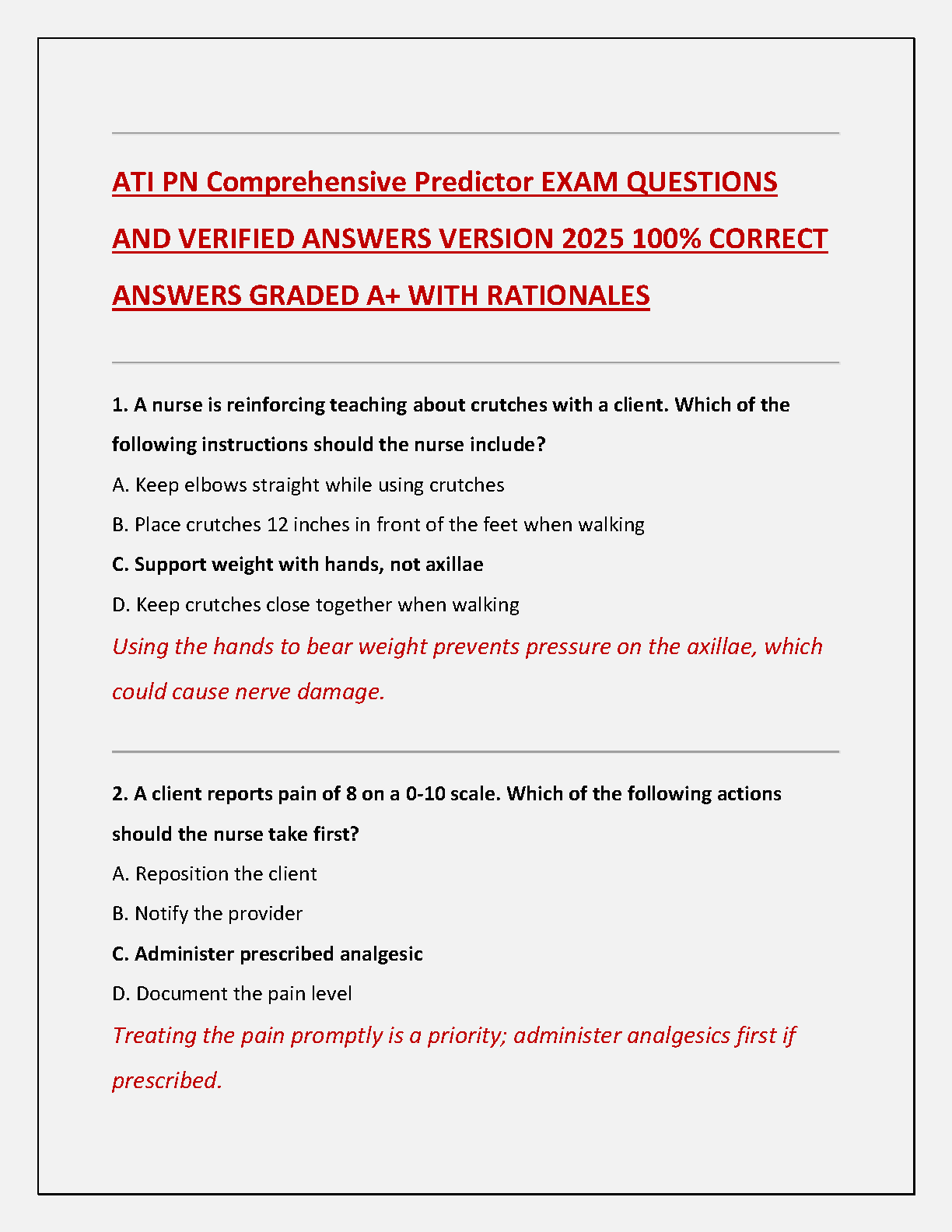 Ace your ATI PN Comprehensive Predictor exam on the very first try with our latest 2025 test bank. This essential study resource is designed for the 2025/2026 academic year and provides a complete set of exam questions paired with 100% verified, correct answers. Each answer is accompanied by a detailed rationale, helping you understand the core concepts, not just memorize the facts. Achieve an A+ grade and confidently step into your nursing career. This digital test bank is your ultimate tool to avoid resits and pass with flying colors.