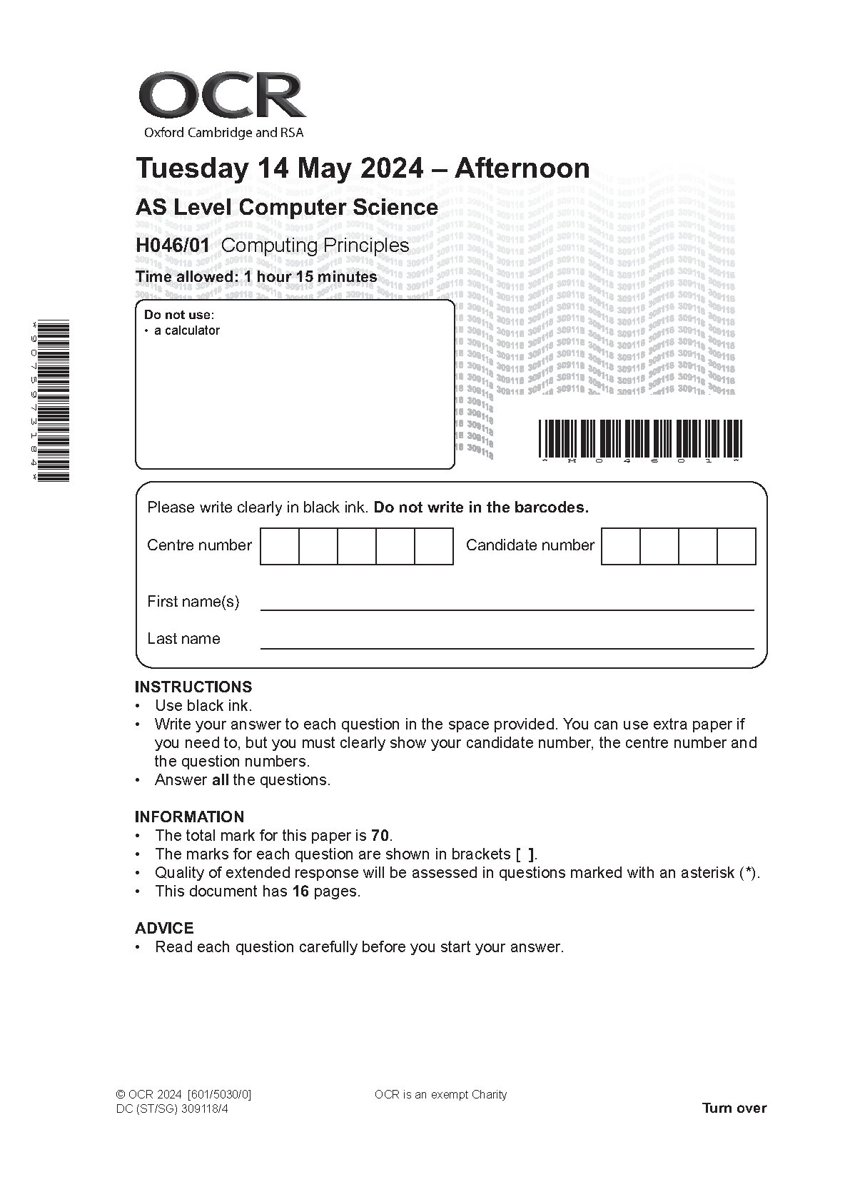 Pass First Try: OCR AS Level Computer Science H046/01 Computing Principles May 2024 Exam Paper - Latest 2025/2026 Resource