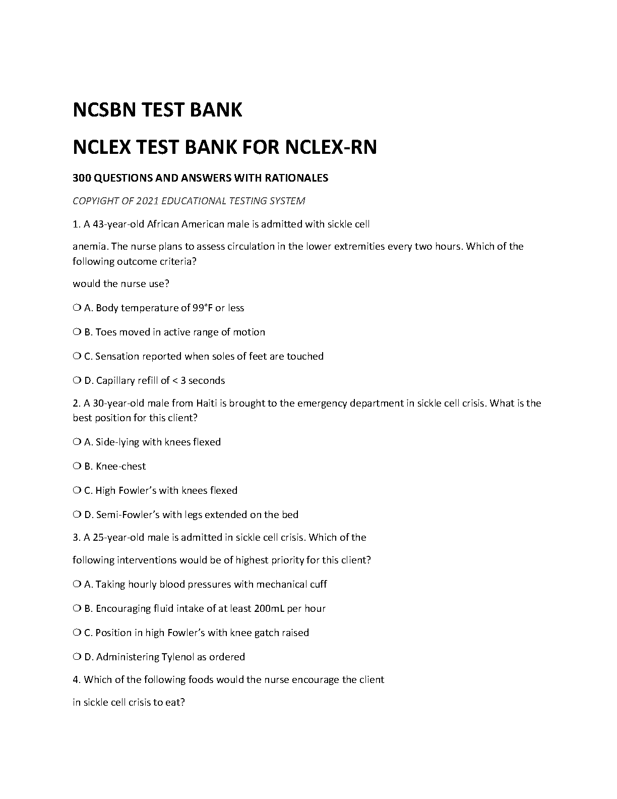 Ace your NCLEX-RN exam on the first try with this comprehensive test bank from NCSBN. This resource features 300 practice questions, complete with detailed answers and rationales, mirroring the actual exam format. Designed to sharpen your critical thinking and clinical judgment skills, this 2021 collection is an essential tool for nursing students aiming for licensure. Prepare effectively, build confidence, and walk into your exam ready to pass and avoid resits.