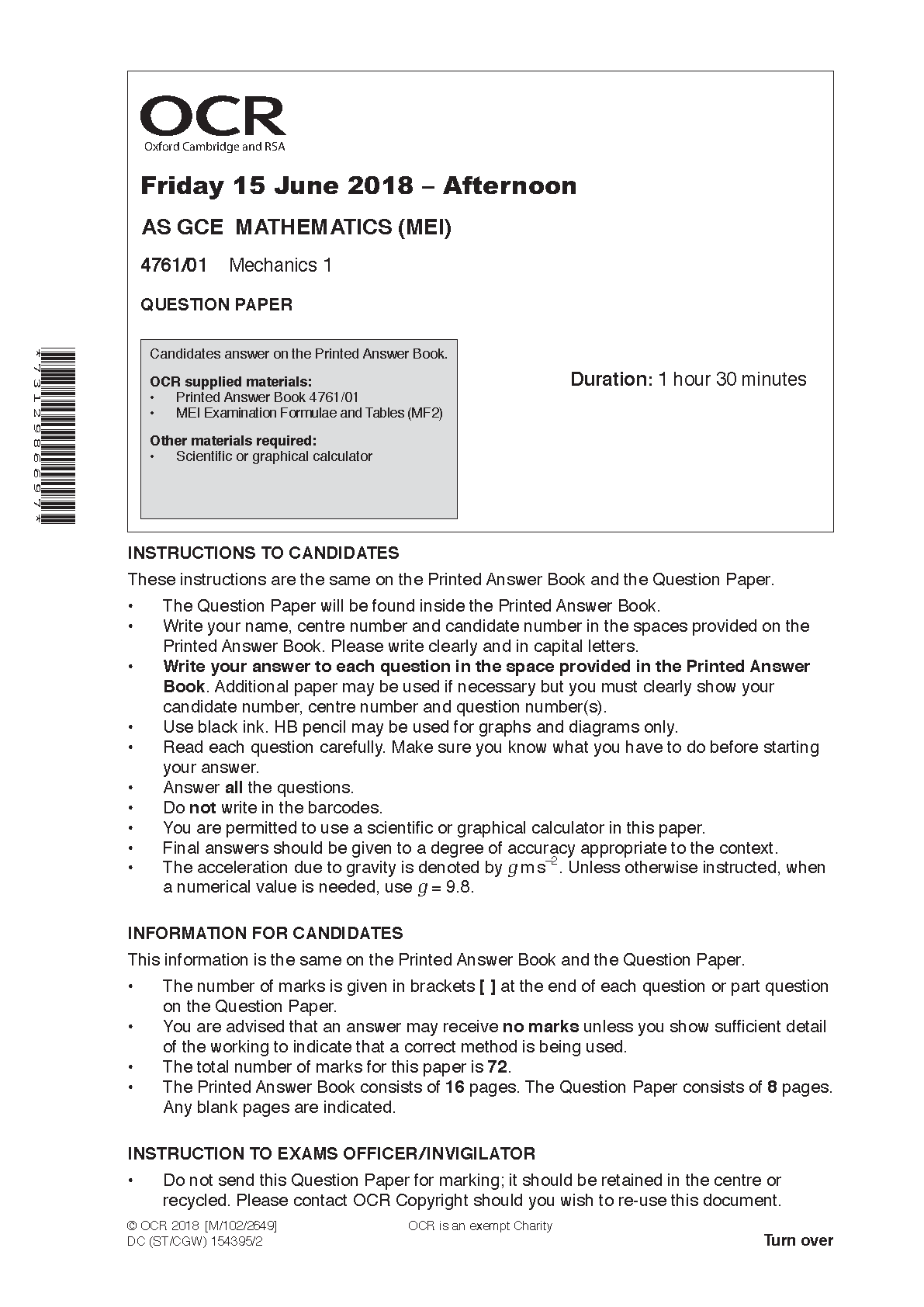 Master OCR AS Level Maths: Mechanics 1 (MEI) 4761/01 | June 2018 Exam Paper for 2025/2026 Success