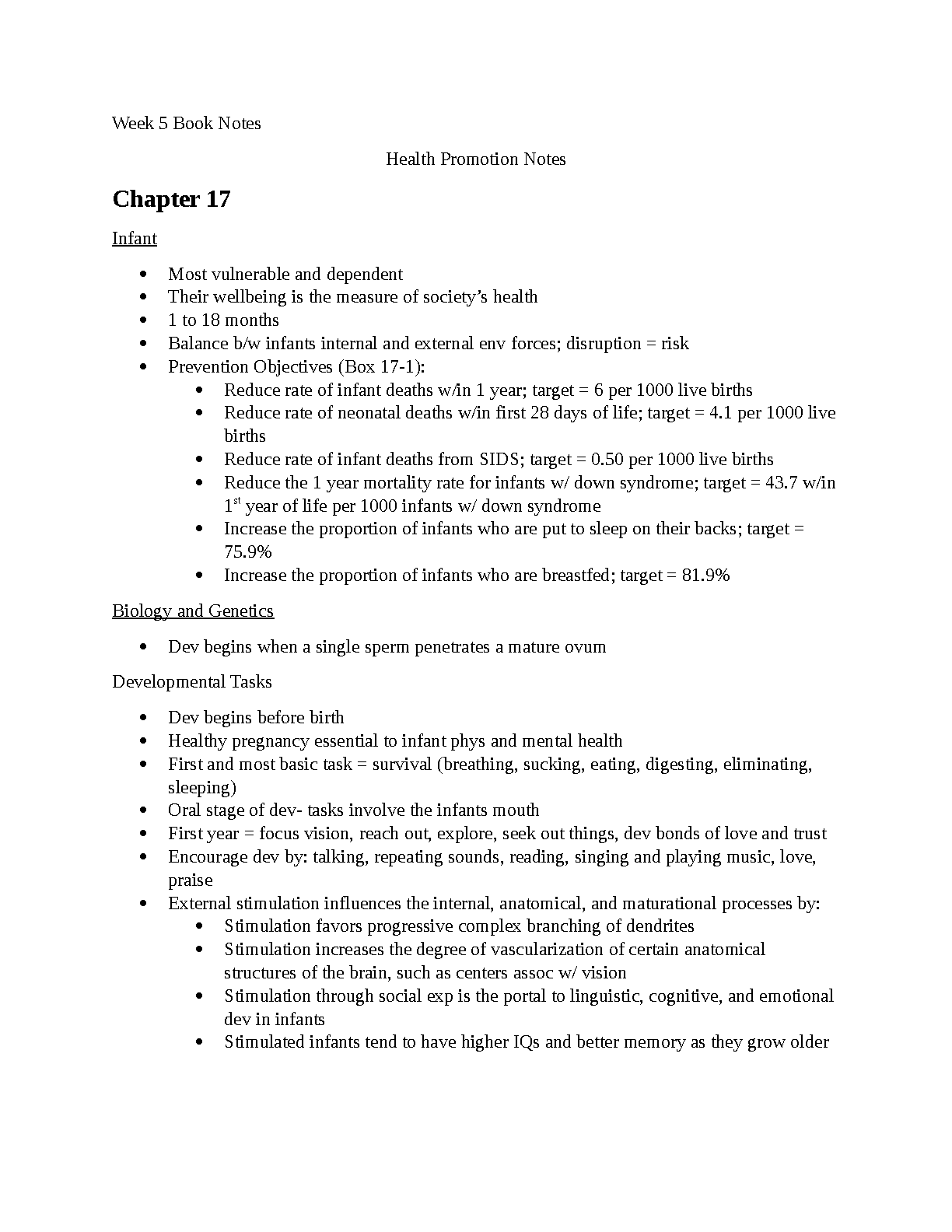 Unlock academic success with our expertly compiled study notes for Chapter 17: The Infant, from 'Health Promotion Throughout the Life Span', 10th Edition. This comprehensive guide covers all critical topics, including infant developmental tasks, key prevention objectives like SIDS reduction, and the fundamentals of biology and genetics in early life. Meticulously updated for the 2025/2026 academic year, these notes are structured to simplify complex concepts and boost your retention. Ideal for nursing and health science students aiming to ace their exams and avoid costly resits. Download now and take the first step towards mastering infant health promotion.