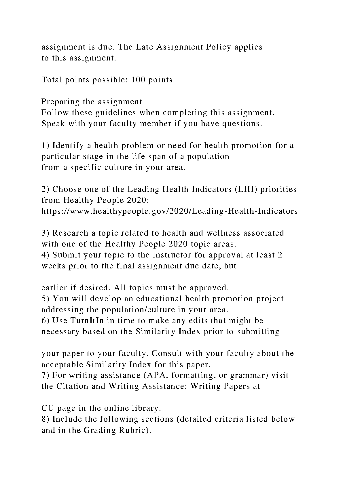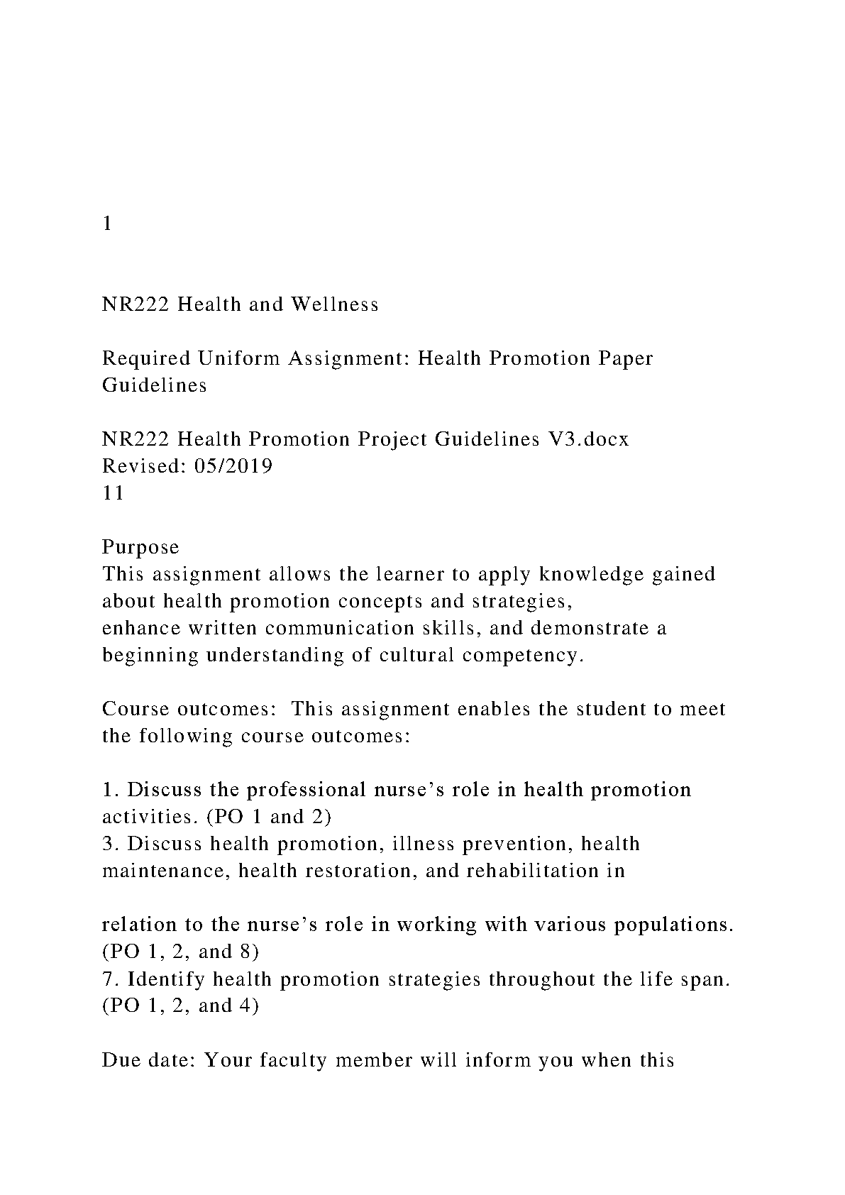 Unlock your full potential in the NR222 Health and Wellness course with our comprehensive guide to the Health Promotion Paper. This latest 2025/2026 resource provides detailed guidelines, covering essential course outcomes such as the professional nurse's role in health promotion, strategies for illness prevention, and identifying health promotion tactics across the human lifespan. Designed to help you master key concepts, enhance your written communication, and develop cultural competency, this guide is your ultimate tool for success. Prepare effectively, submit a top-quality assignment, and pass your exams on the very first try, eliminating the need for costly resits.