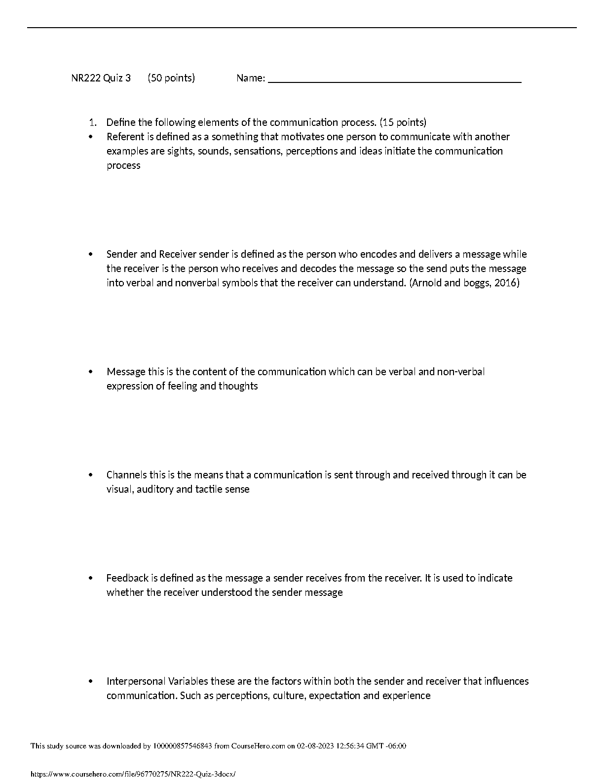 NR222 Quiz 3 Test Bank with Answers | Interpersonal Relationships: Professional Communication Skills for Nurses, 7th Edition by Arnold & Boggs
