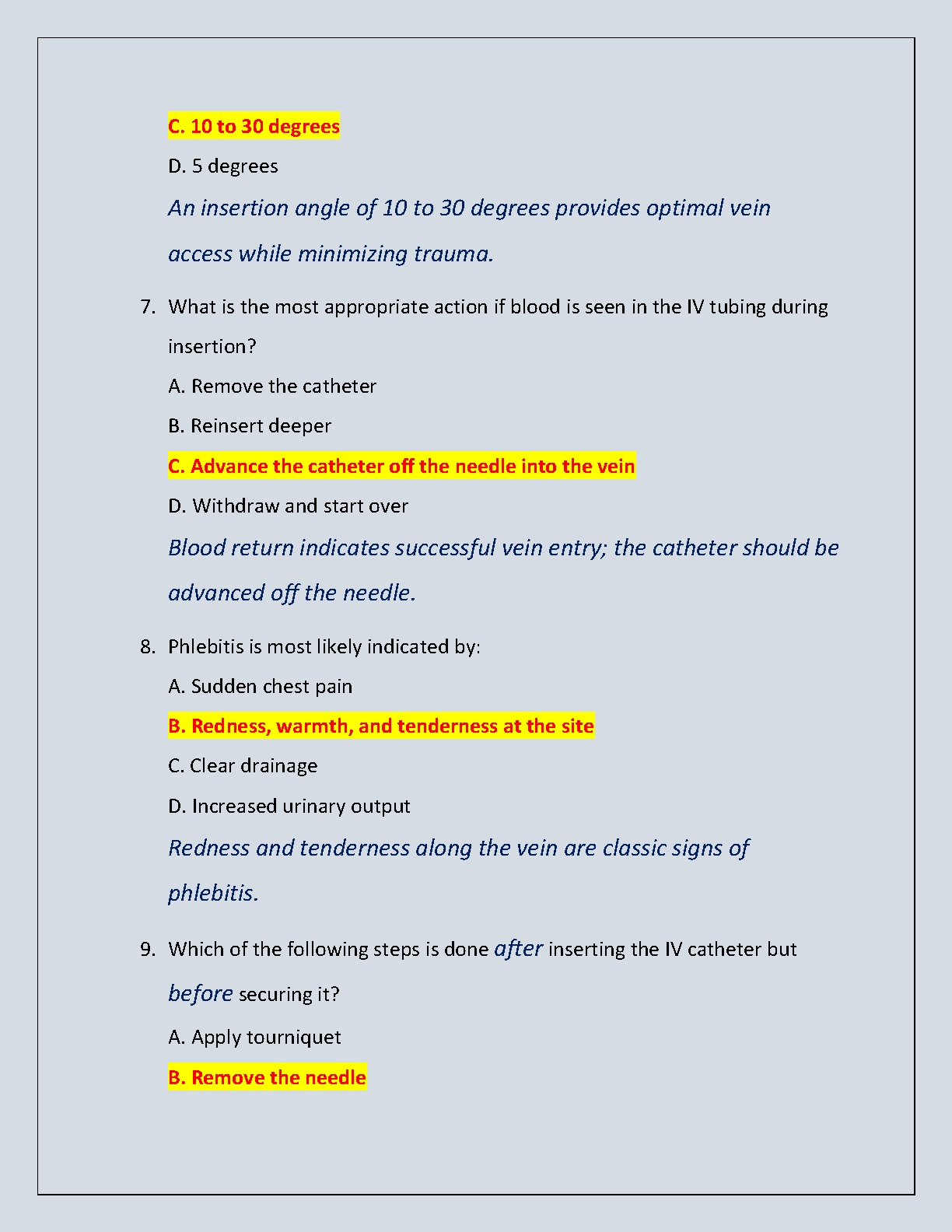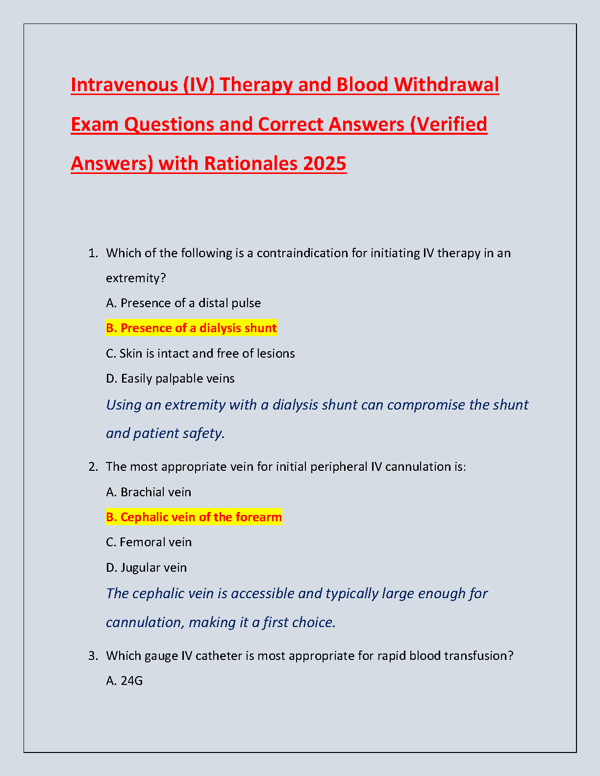 Unlock your potential and master the critical skills of Intravenous (IV) Therapy and Blood Withdrawal with our latest 2025 Test Bank. This comprehensive resource is packed with a wide range of exam-style questions, each accompanied by a verified correct answer and a detailed rationale. Our rationales go beyond simple answers, explaining the 'why' behind each concept to ensure a deep and lasting understanding. Designed to help nursing and medical students pass their exams on the first attempt, this guide is your key to acing tests and avoiding resits. Build your confidence and clinical knowledge effectively with this essential study tool.
