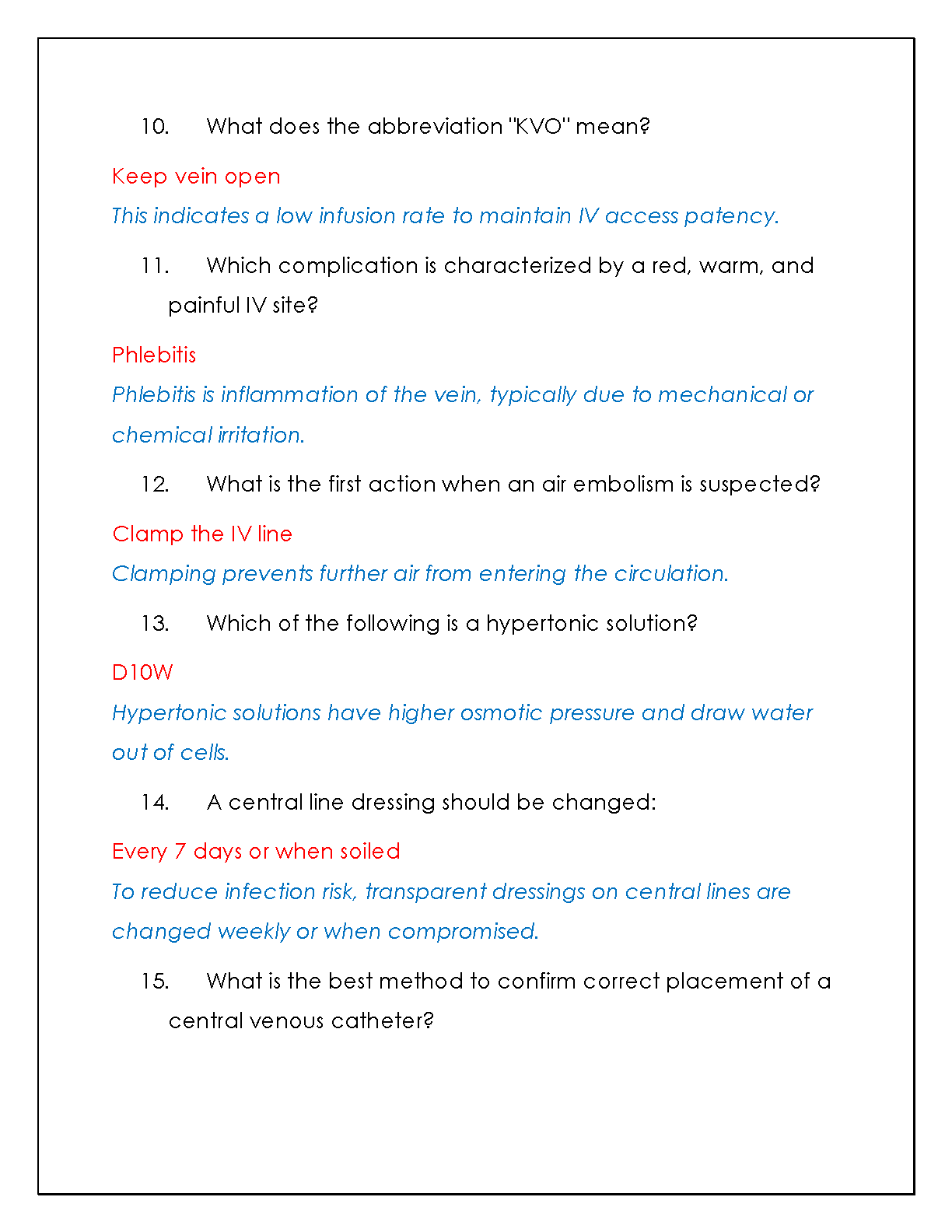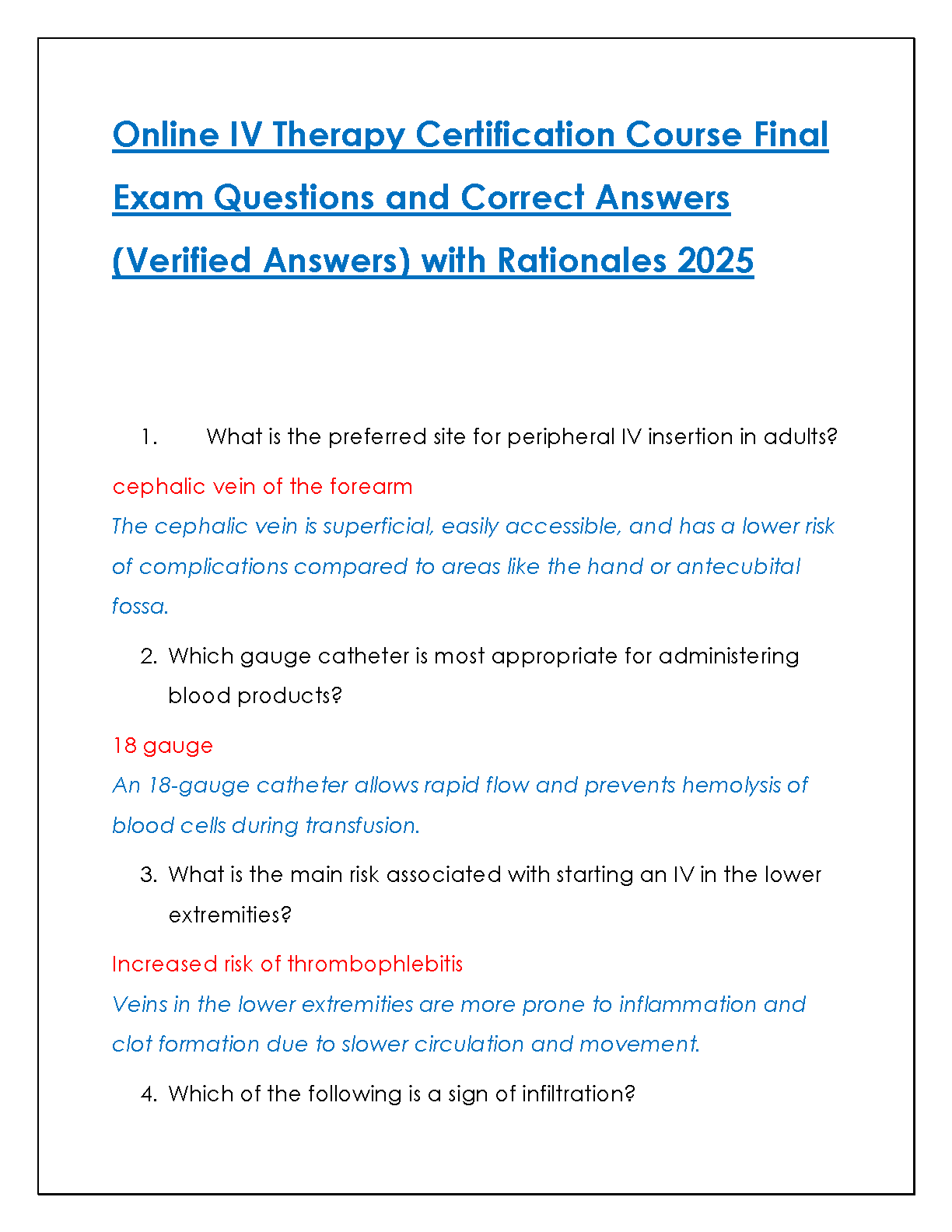Prepare to excel in your Online IV Therapy Certification Course Final Exam with our latest 2025/2026 study resource. This comprehensive test bank is meticulously compiled with a full range of potential exam questions, each accompanied by a verified correct answer and a detailed rationale. Our guide is designed to deepen your understanding of critical concepts, from selecting the proper IV insertion sites to managing complications. Perfect for nursing students and healthcare professionals aiming to pass their certification on the very first try. Don't just study—master the material and walk into your exam with confidence!