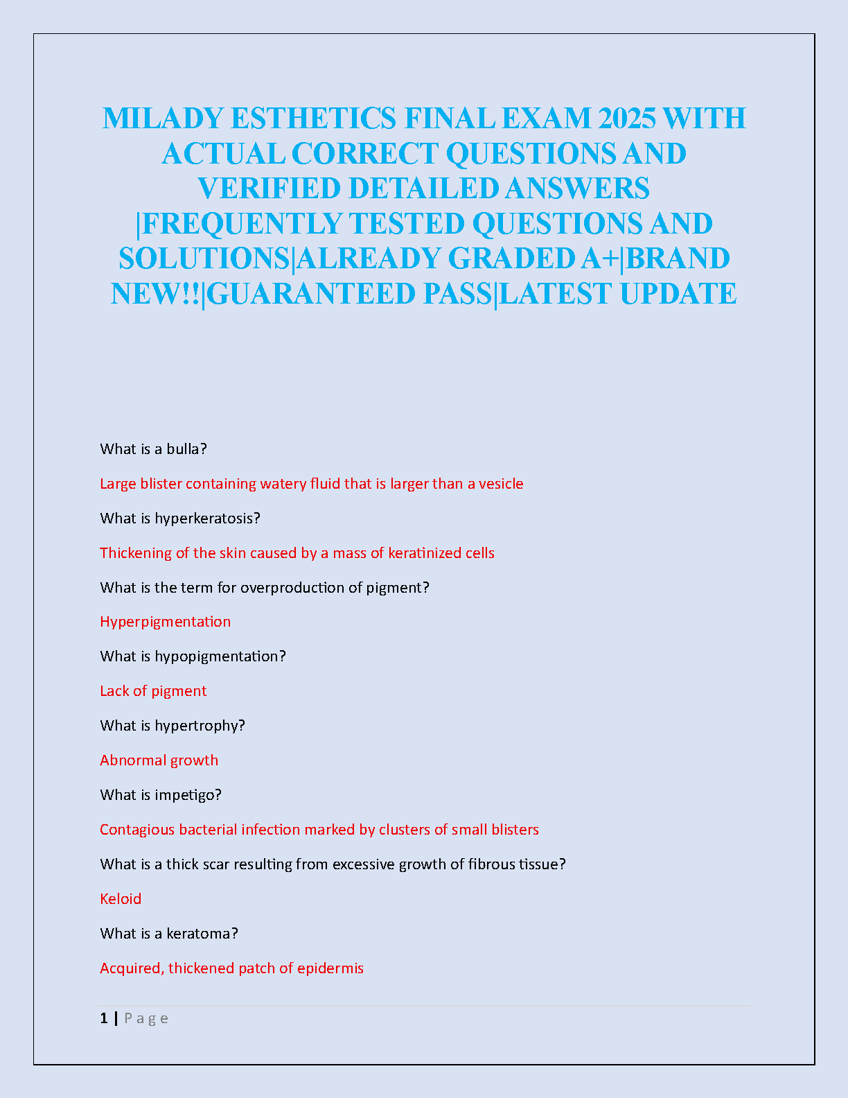 Ace your esthetics final exam with confidence! This is the complete, latest update for the Milady Esthetics Final Exam for 2025, based on the 12th Edition of the Milady Standard Esthetics textbook. Our test bank features a comprehensive collection of frequently tested questions, each with a correct, verified, and detailed answer. Designed to help you master key concepts and achieve an A+ grade, this resource is your ultimate study guide for passing on the first attempt. Say goodbye to exam anxiety and get the guaranteed pass you need to advance in your esthetics career. All solutions are clearly explained and ready for immediate study.