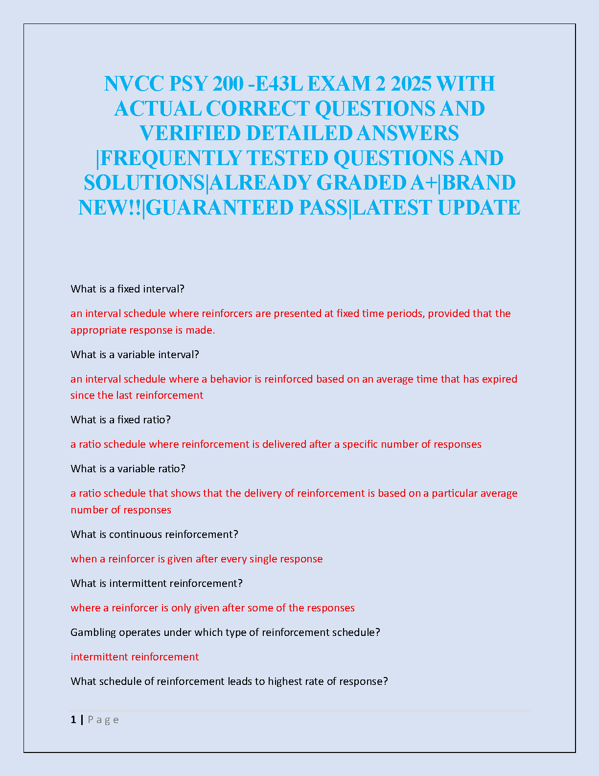 Master the concepts for NVCC PSY 200 Exam 2 with this comprehensive and newly updated exam elaboration, tailored for the 2025/2026 academic year. This essential study guide provides a curated collection of frequently tested questions accompanied by detailed, verified answers to ensure you achieve a deep understanding of the material. Key topics include principles of reinforcement schedules like fixed interval, variable interval, fixed ratio, and variable ratio. This resource is expertly designed to help you pass with confidence, secure a top grade, and avoid the stress of resits. Get instant access to the study material that guarantees success.
