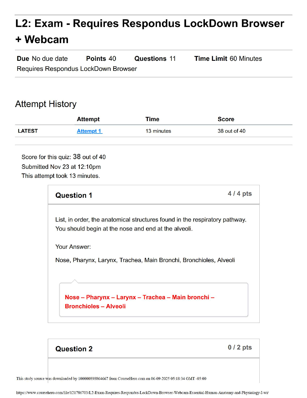Unlock top grades in your Anatomy and Physiology course with this comprehensive test bank for the L2 Exam, based on 'Essentials of Human Anatomy & Physiology, 13th Edition' by Marieb and Keller. This resource features a complete set of questions and expertly verified answers, as demonstrated by the high score of 38/40. Master complex topics like the respiratory pathway and confidently prepare for your exams. Download now to gain the edge you need to succeed and pass with flying colors!